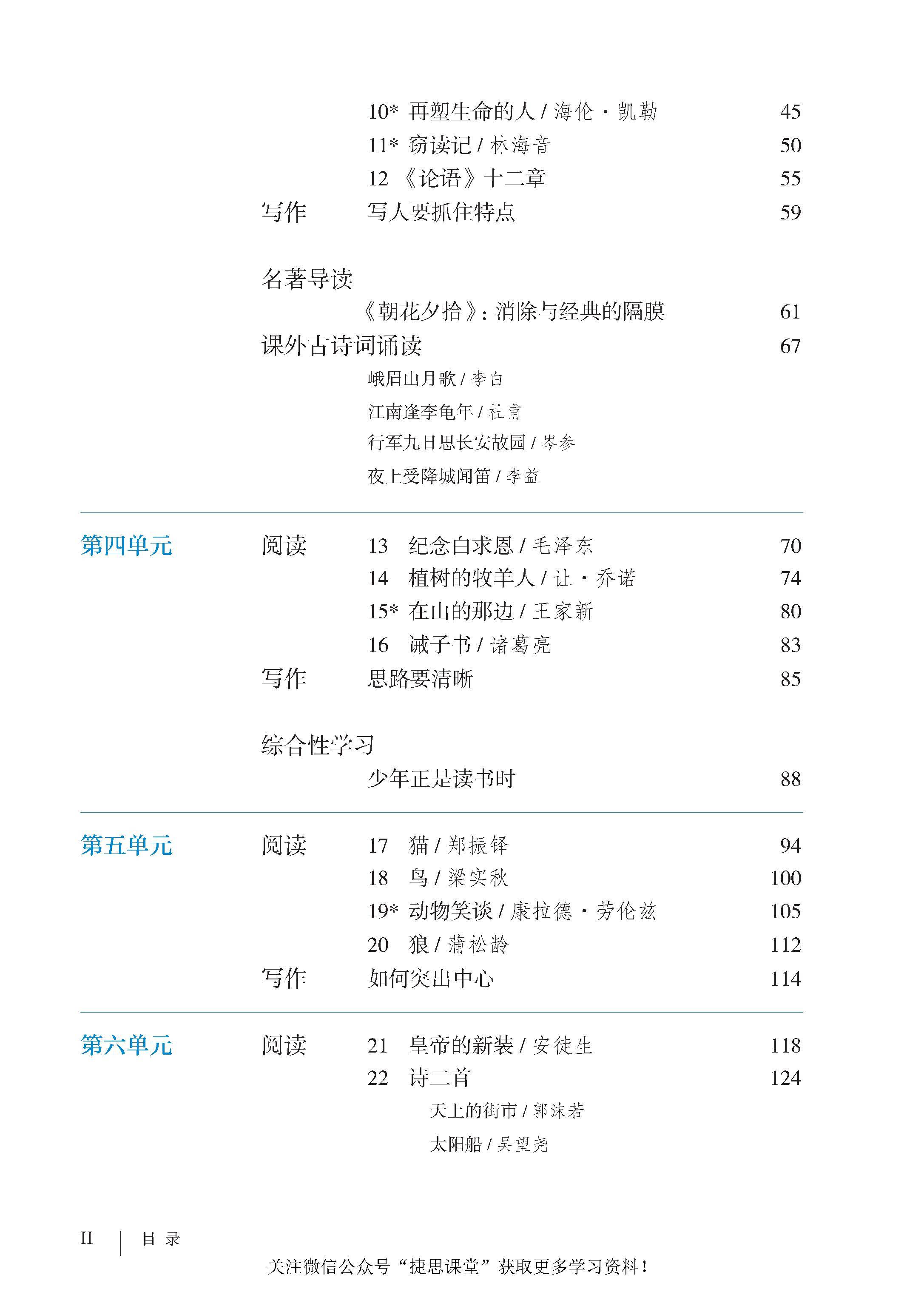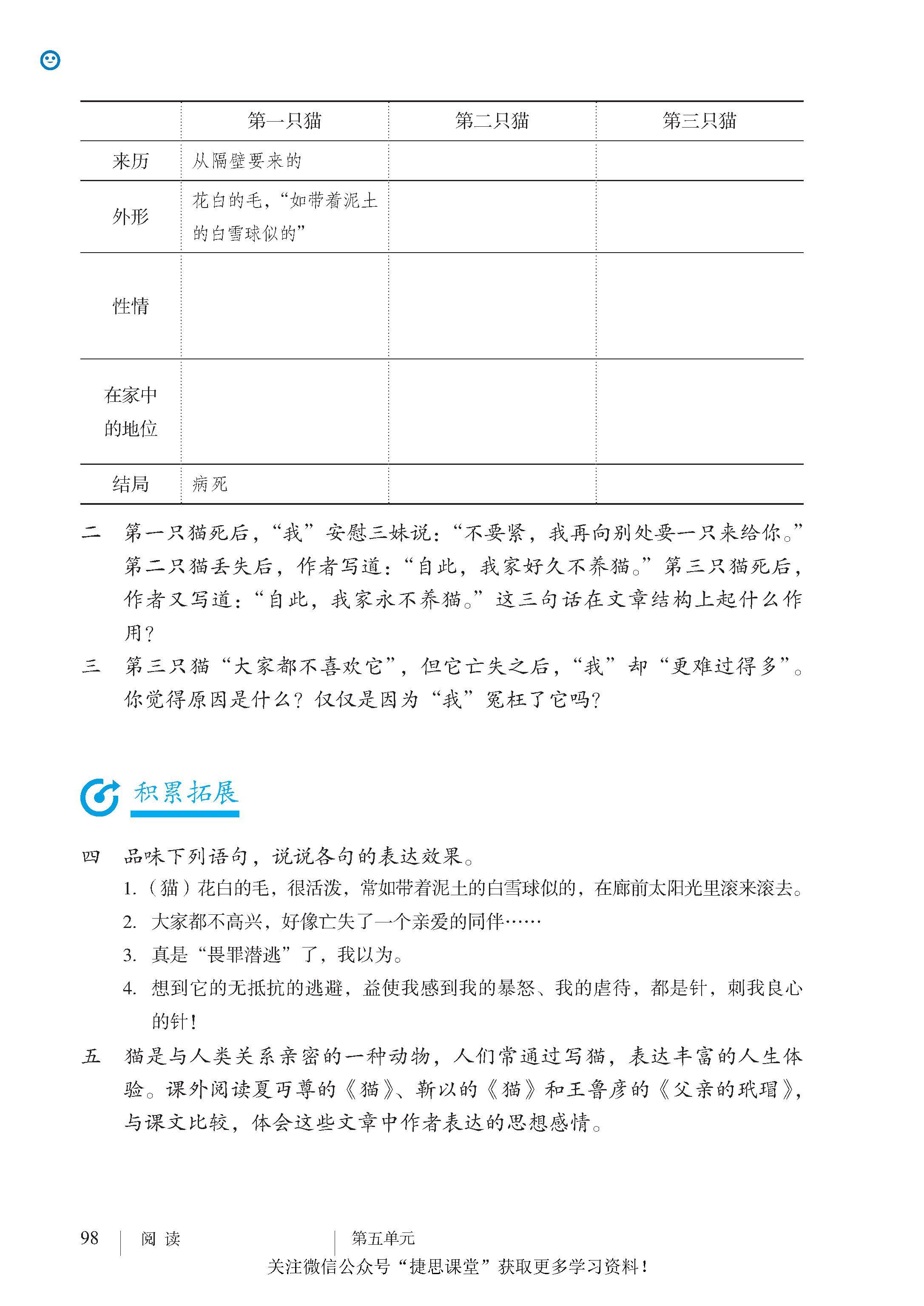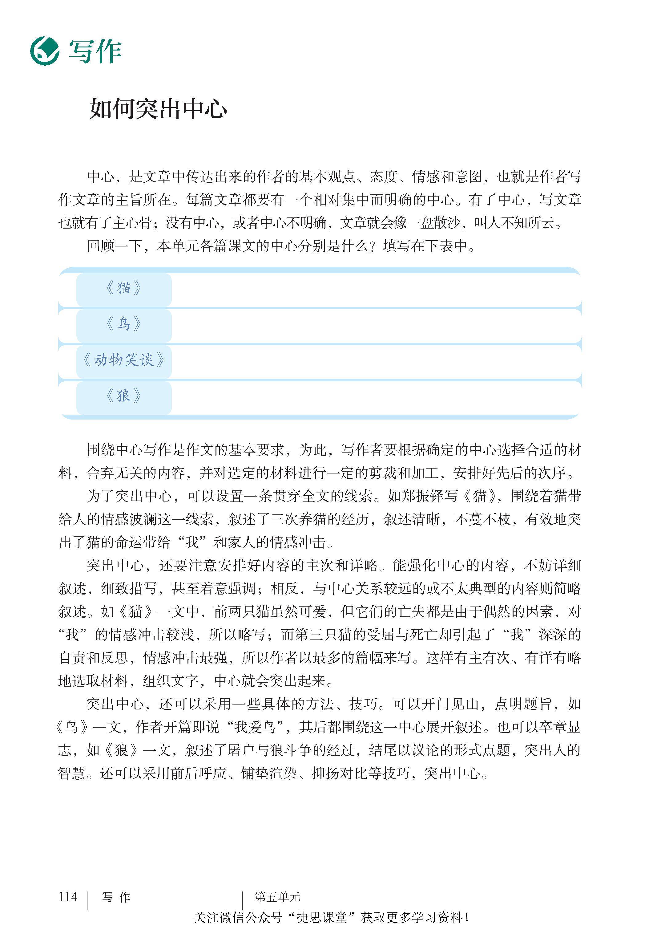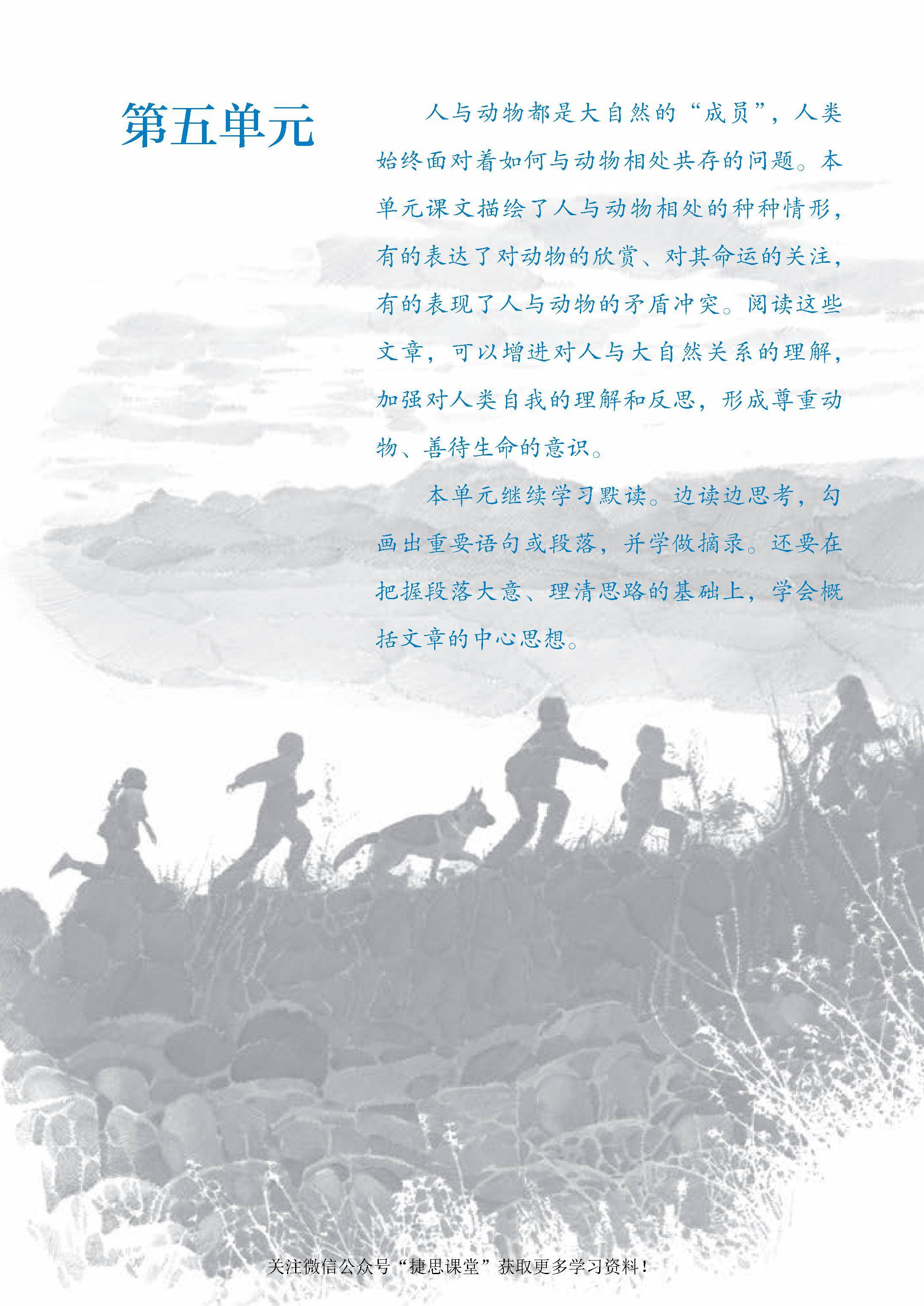 任务一 体会人与动物的关系:17. 猫 / 郑振铎18. 我的白鸽 / 陈忠实19. 大雁归来 / 利奥波德20. 狼 / 蒲松龄任务二 亲近动物,丰富生命体验任务三 记叙与动物的相处
