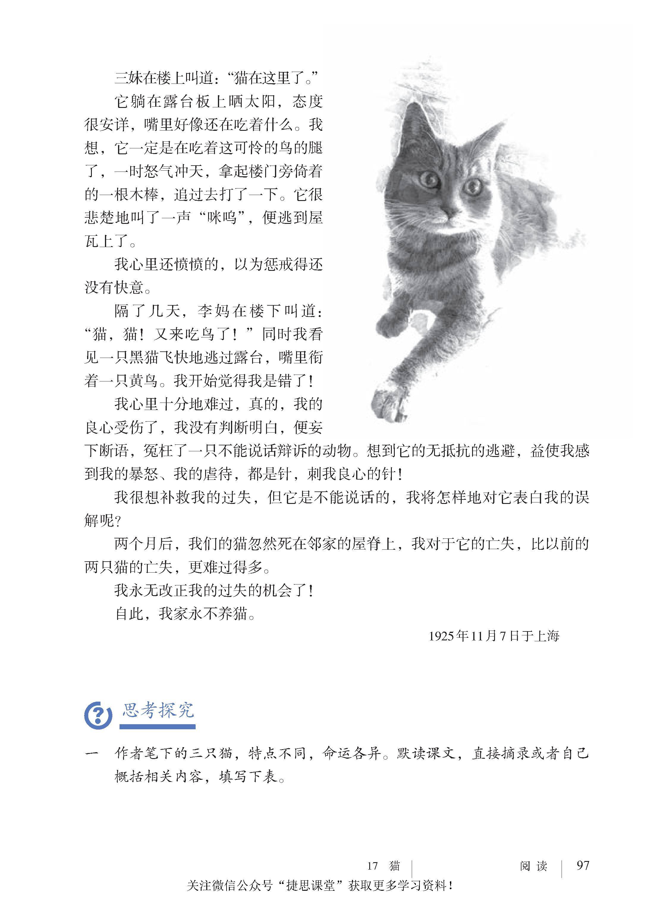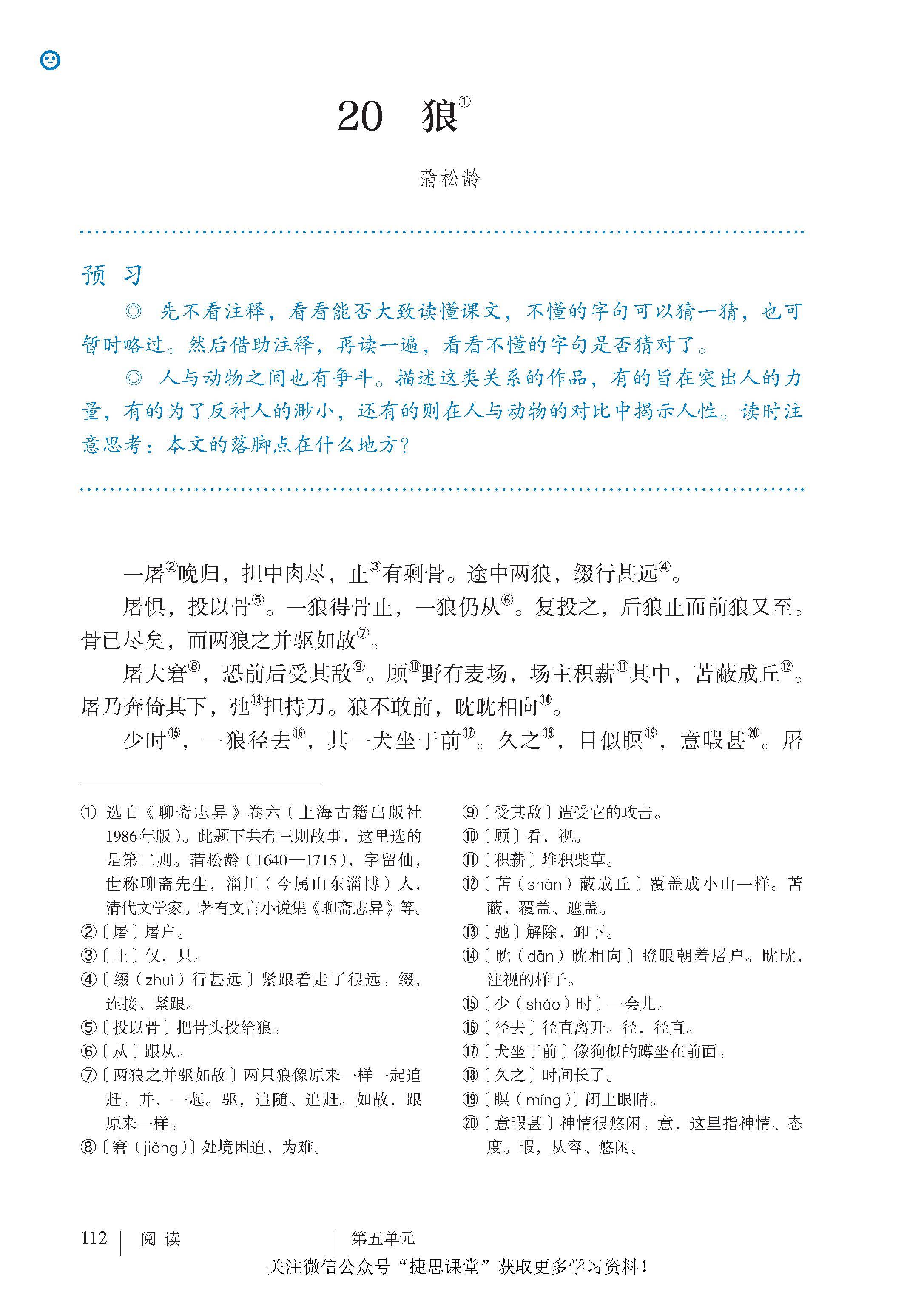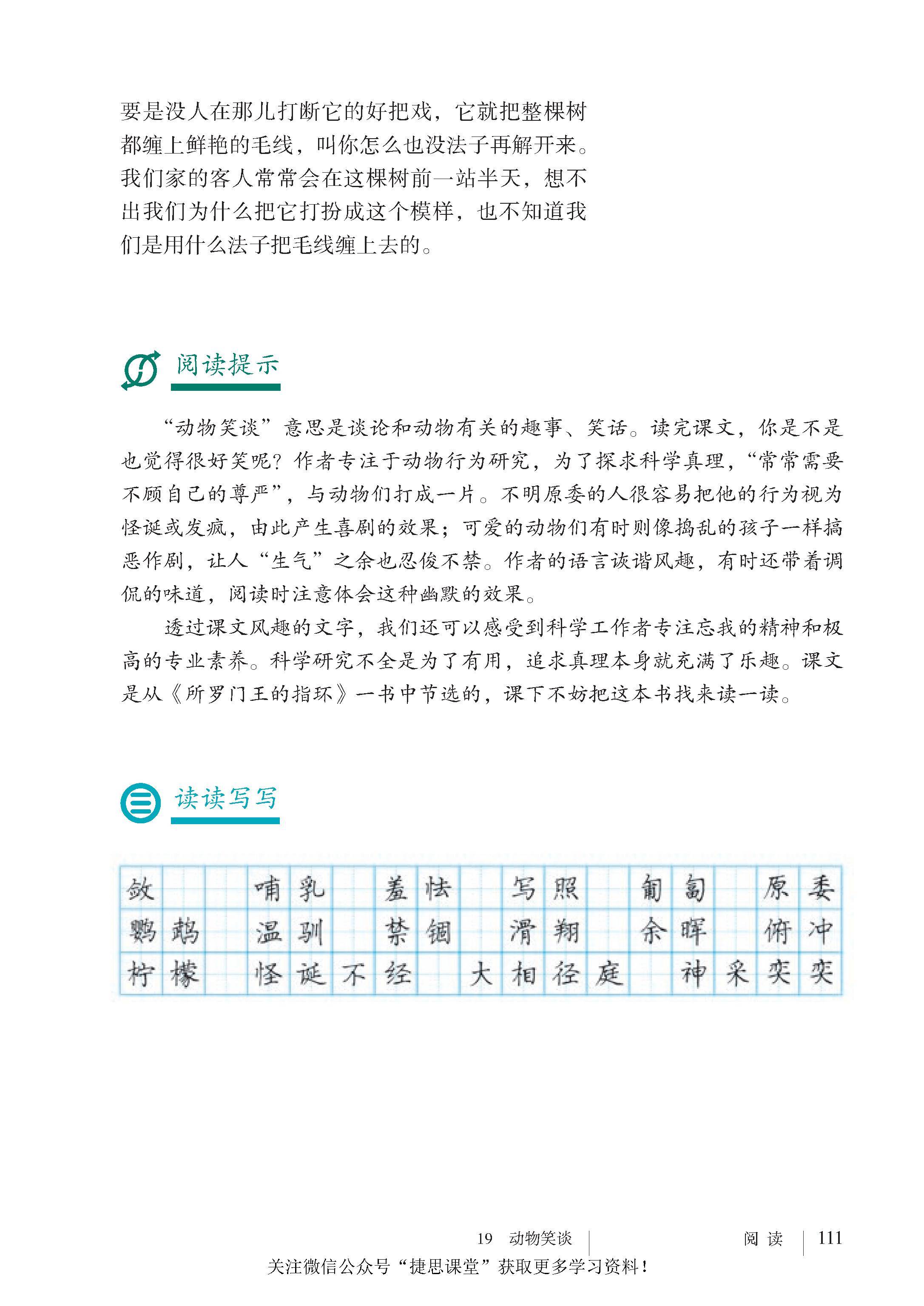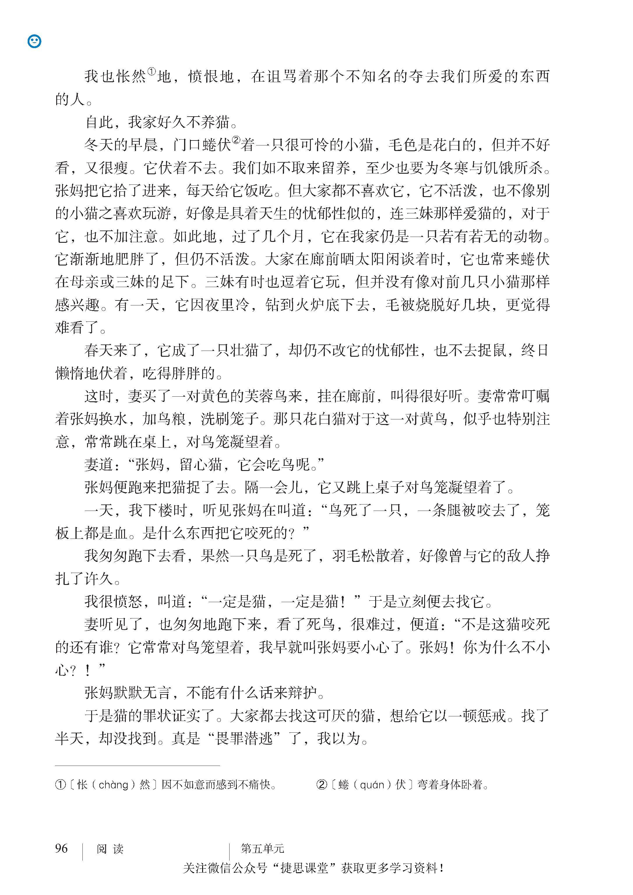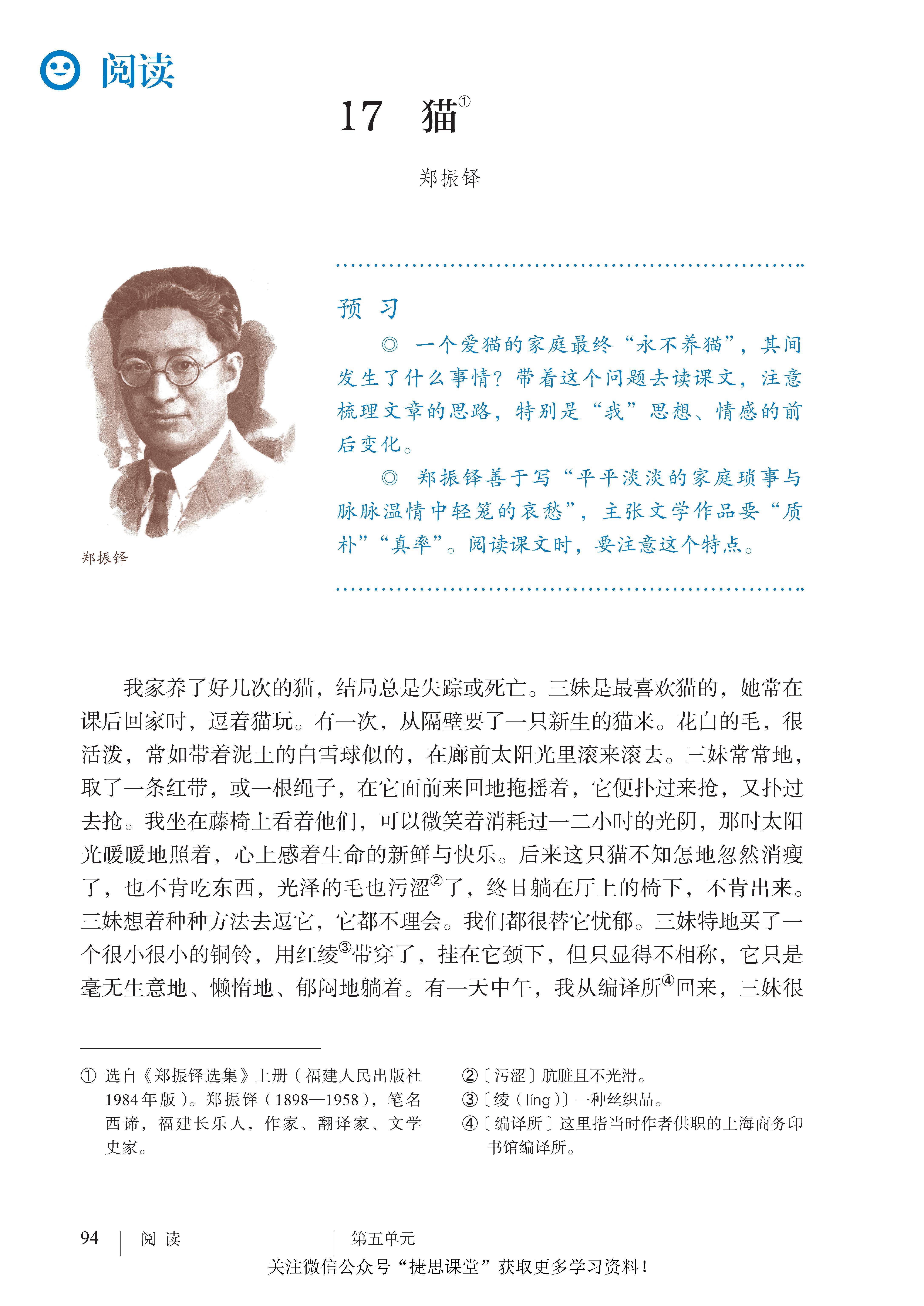 任务一 体会人与动物的关系:17. 猫 / 郑振铎18. 我的白鸽 / 陈忠实19. 大雁归来 / 利奥波德20. 狼 / 蒲松龄任务二 亲近动物,丰富生命体验任务三 记叙与动物的相处