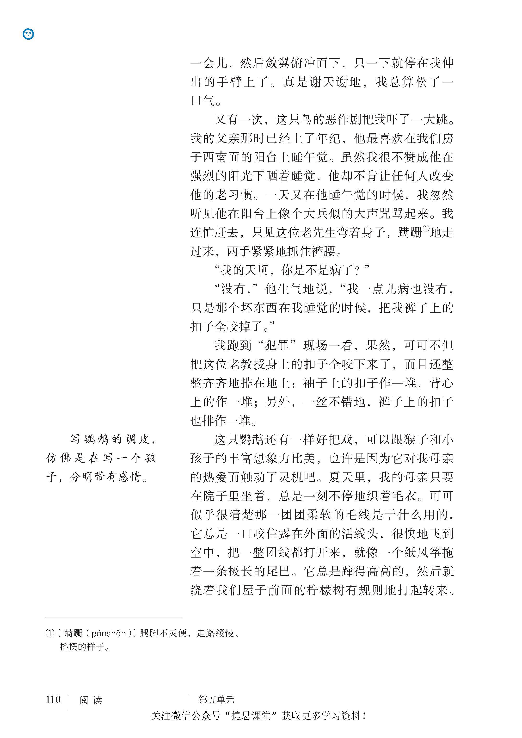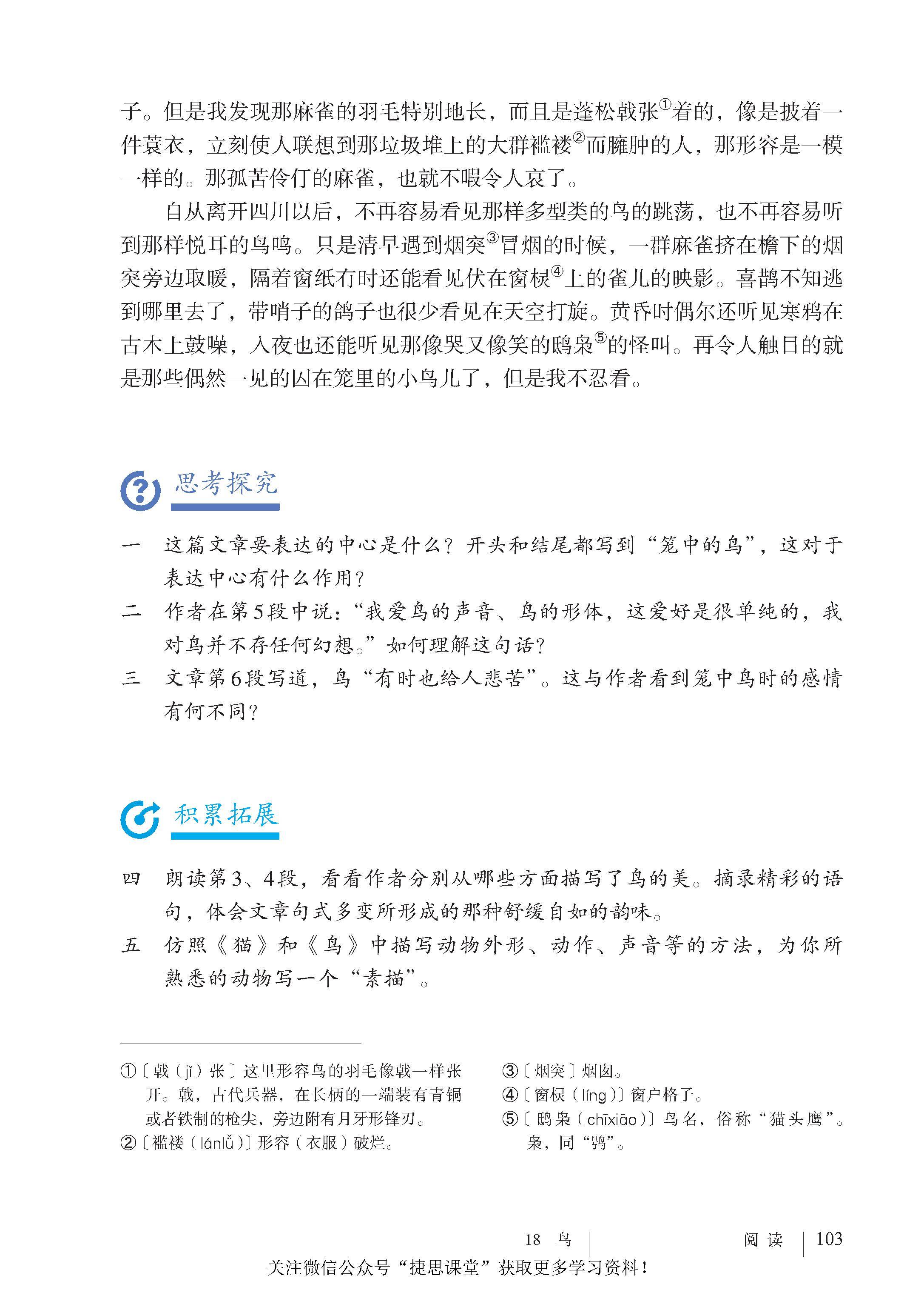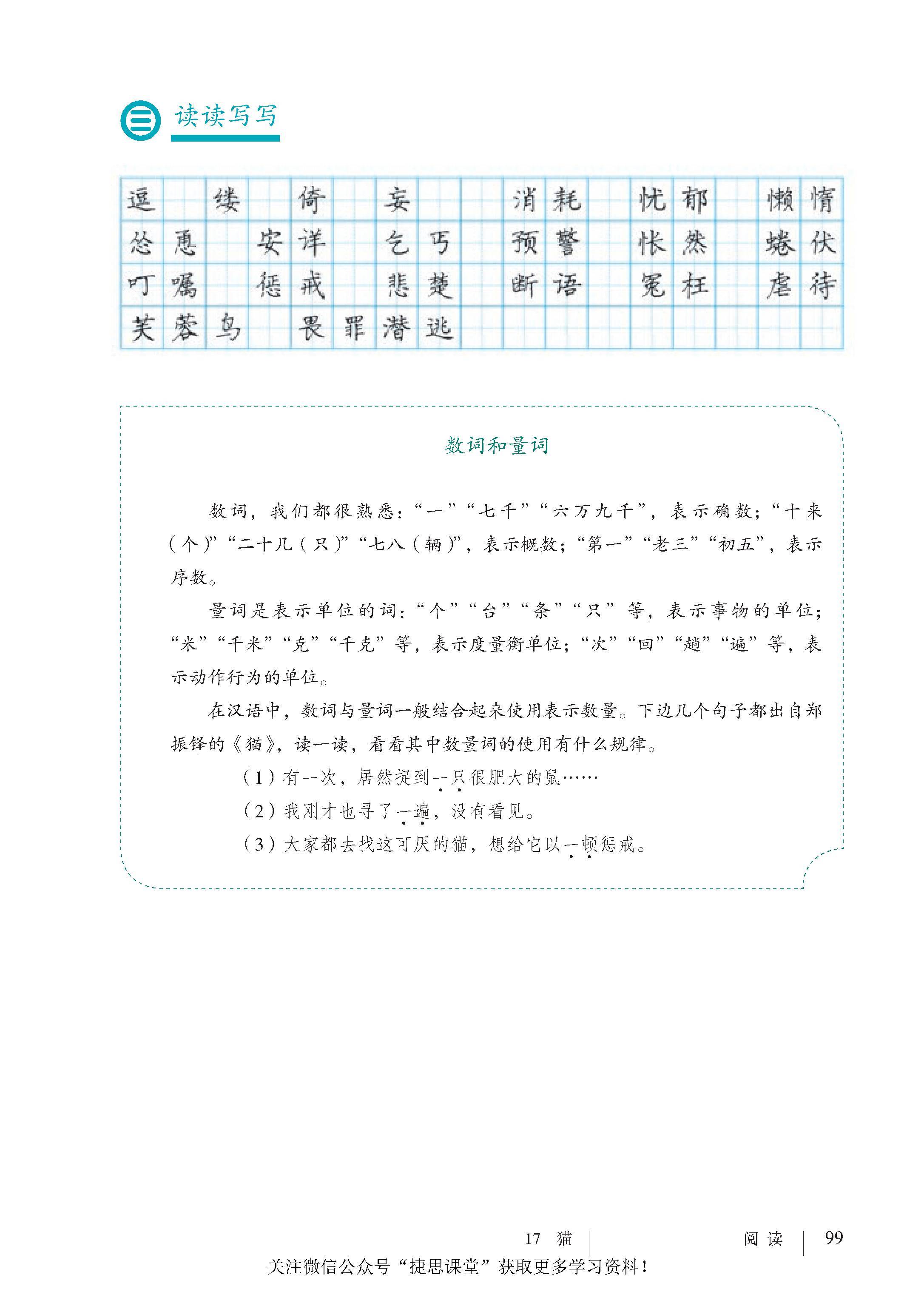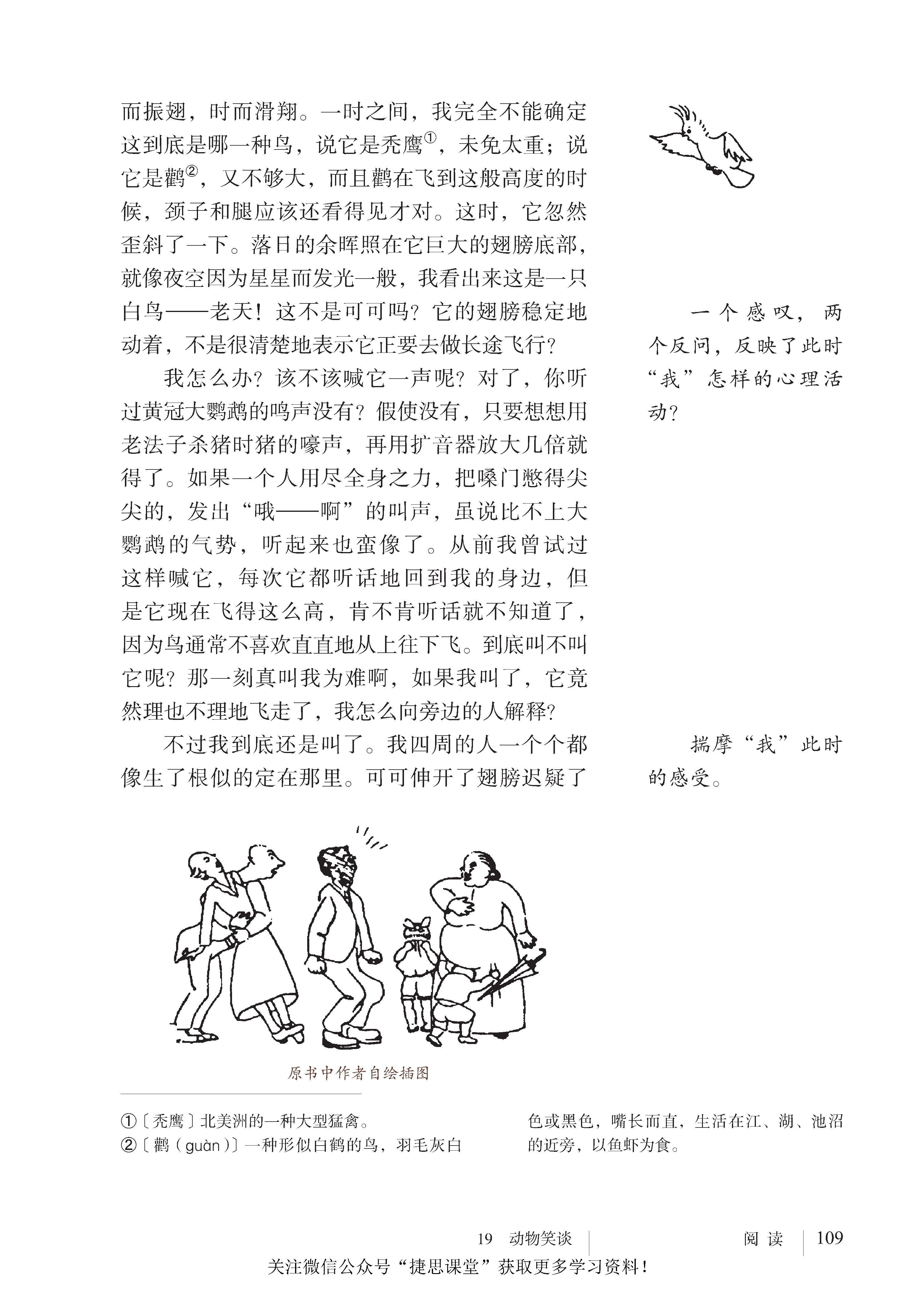 任务一 体会人与动物的关系:17. 猫 / 郑振铎18. 我的白鸽 / 陈忠实19. 大雁归来 / 利奥波德20. 狼 / 蒲松龄任务二 亲近动物,丰富生命体验任务三 记叙与动物的相处
