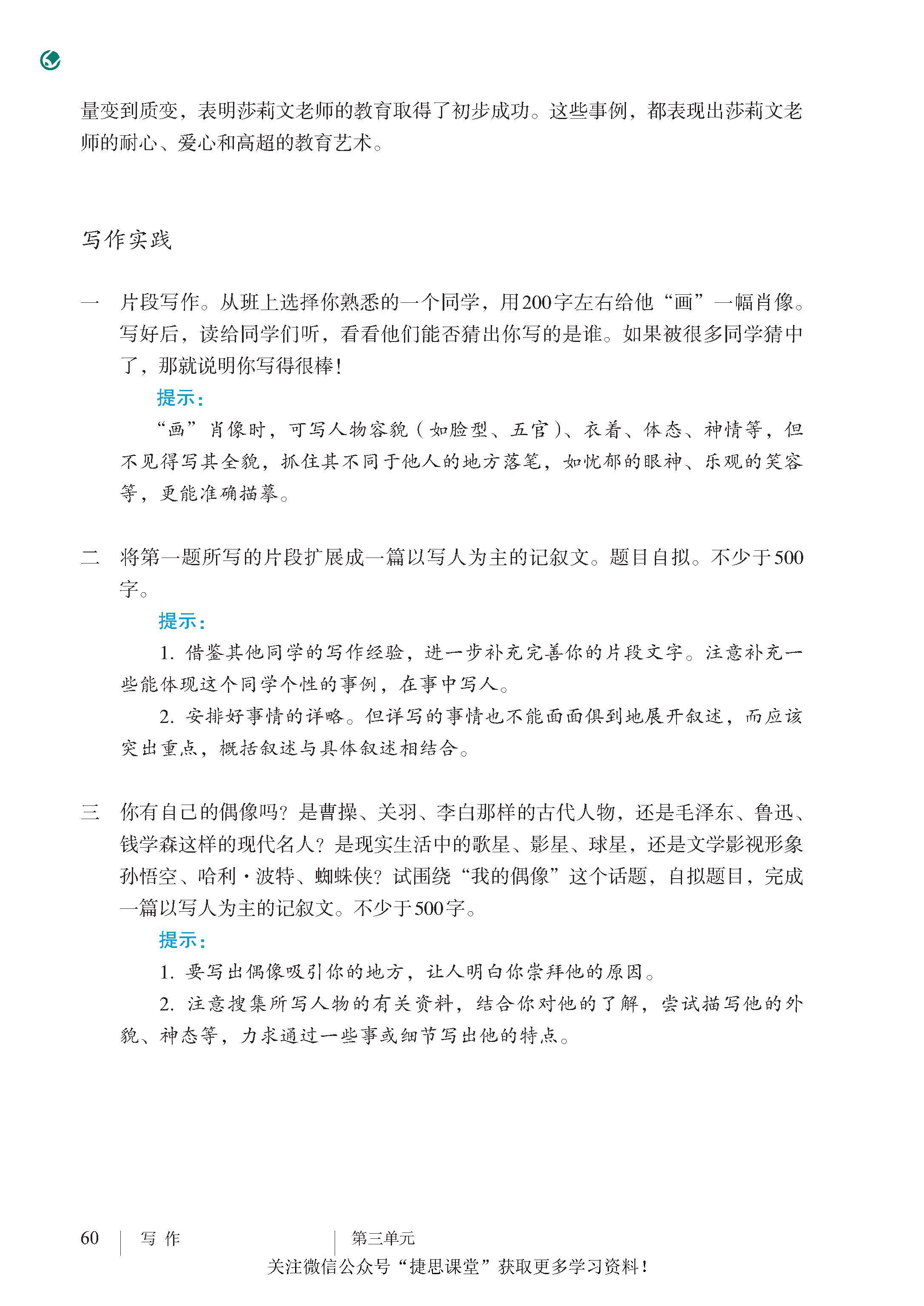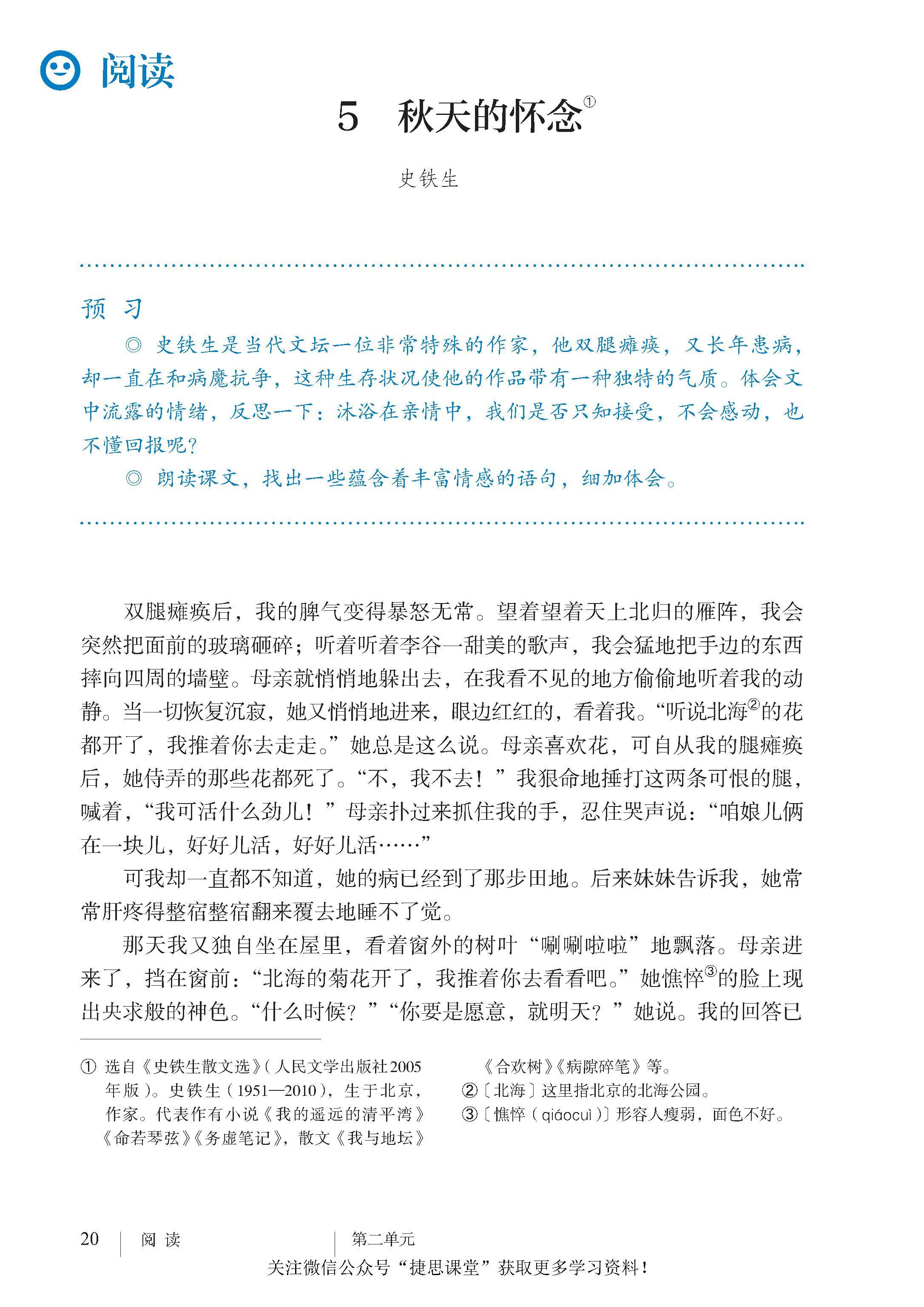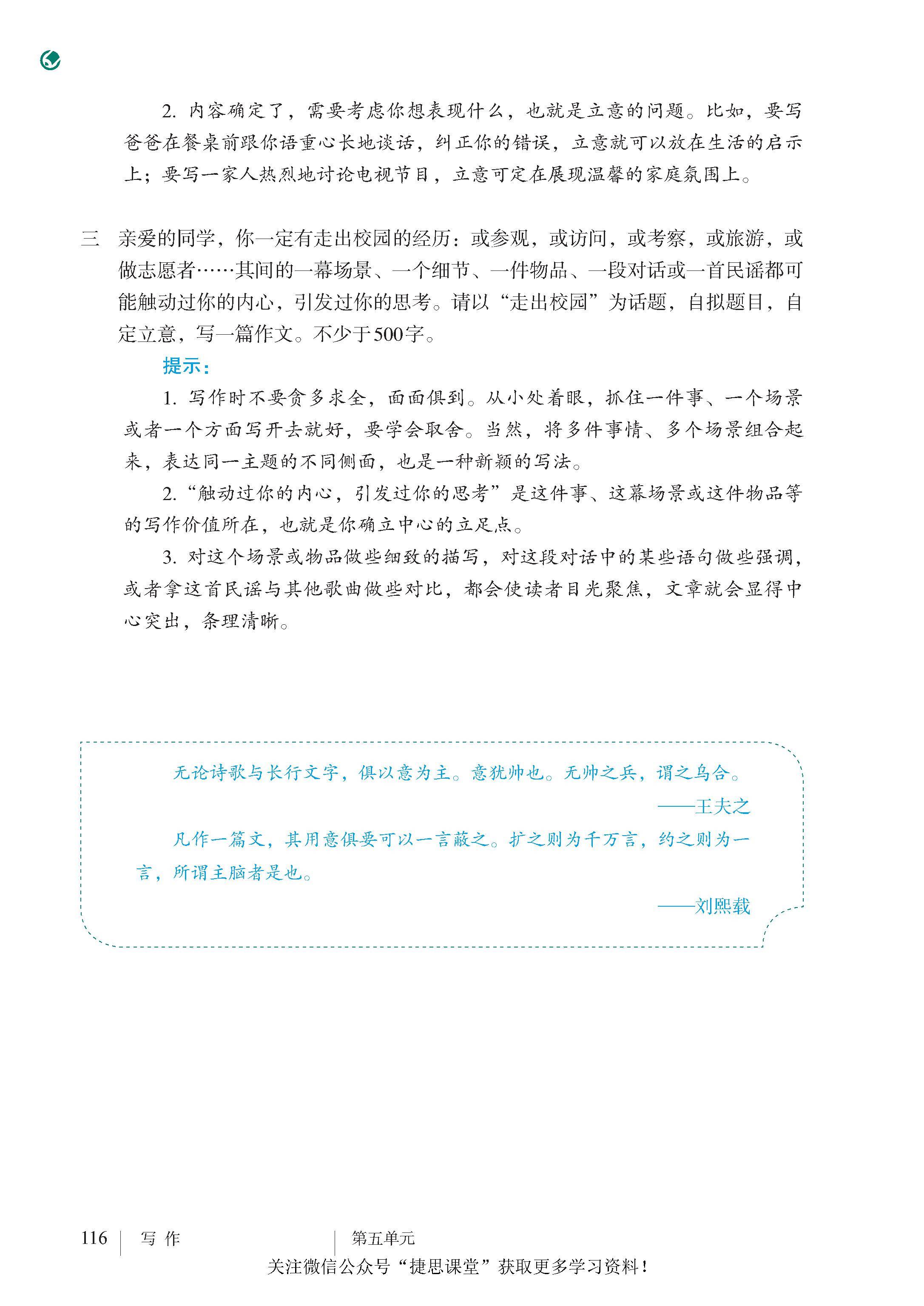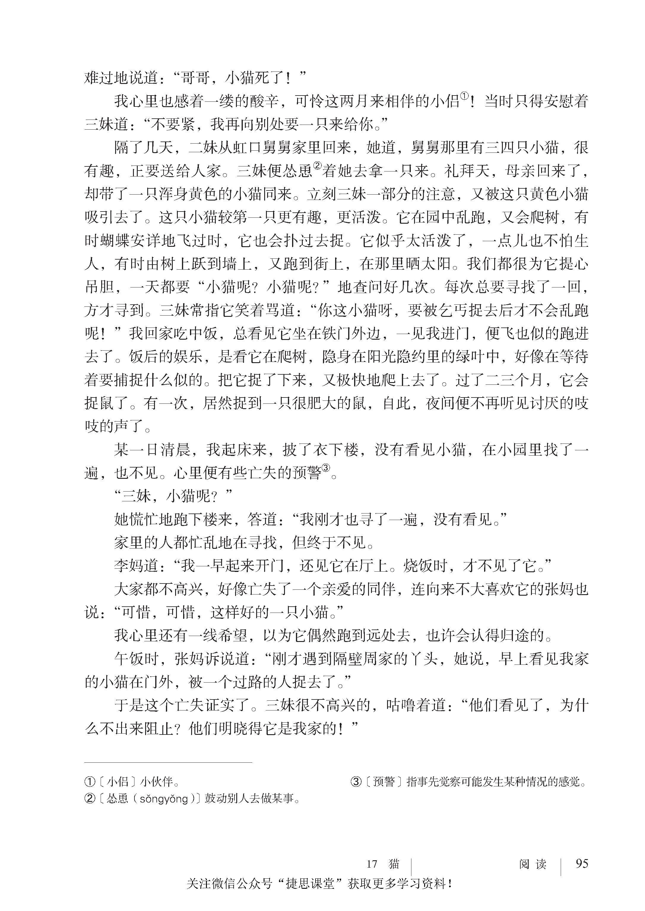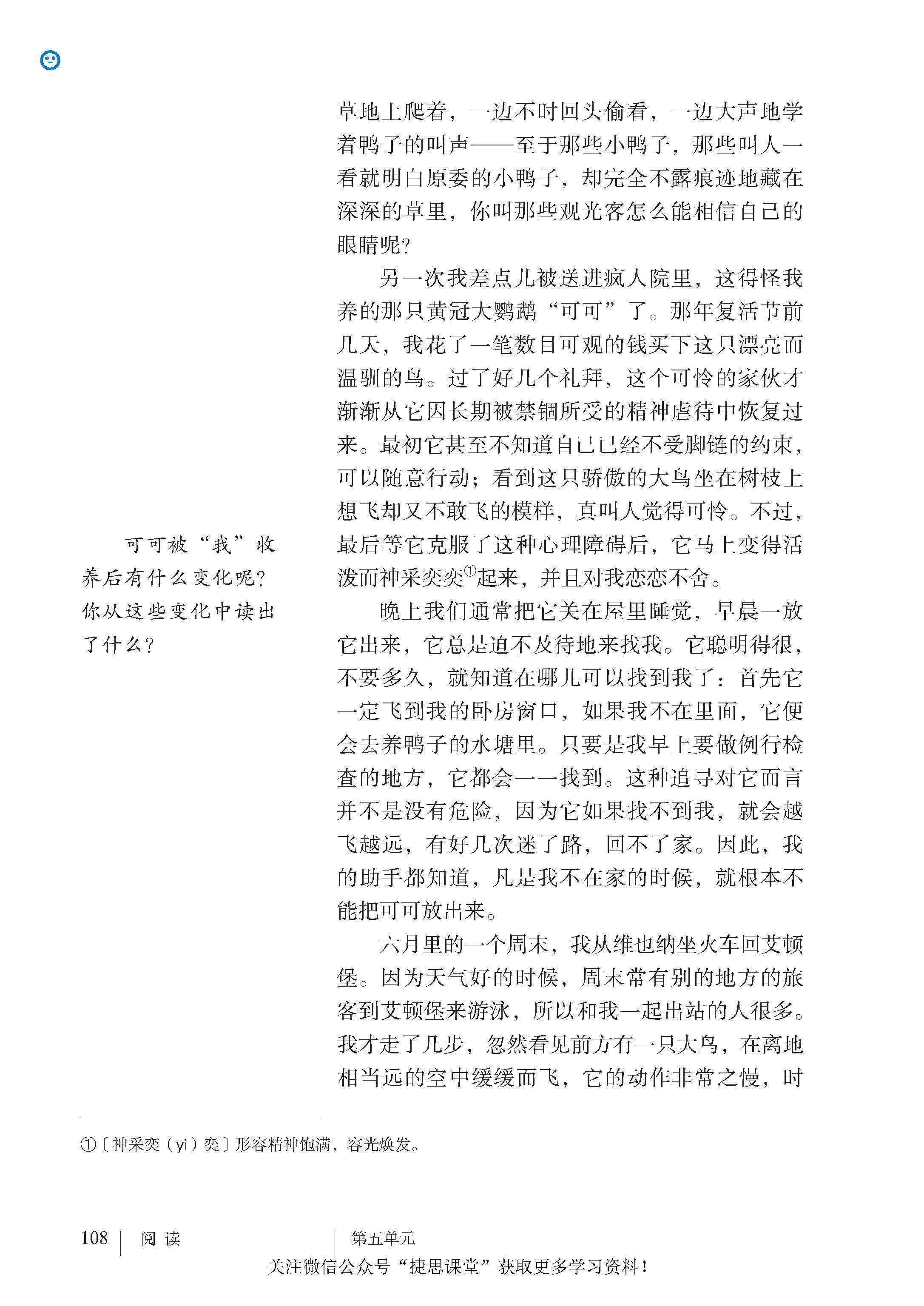 任务一 体会人与动物的关系:17. 猫 / 郑振铎18. 我的白鸽 / 陈忠实19. 大雁归来 / 利奥波德20. 狼 / 蒲松龄任务二 亲近动物,丰富生命体验任务三 记叙与动物的相处