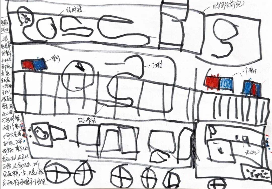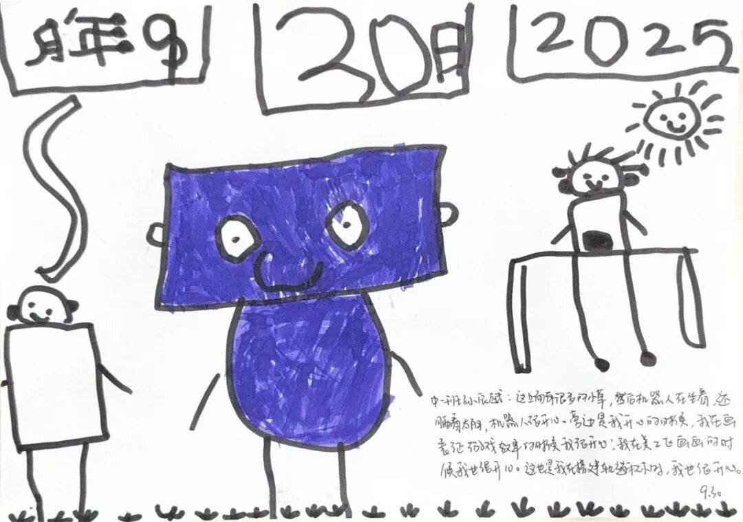 这上面有很多的小草,然后机器人在坐着,还晒着太阳,机器人很开心。旁边这是我开心的时候,我在画游戏故事的时候我很开心,我在美工区画画的时候我也很开心,我在搭建轨道积木时我也很开心!