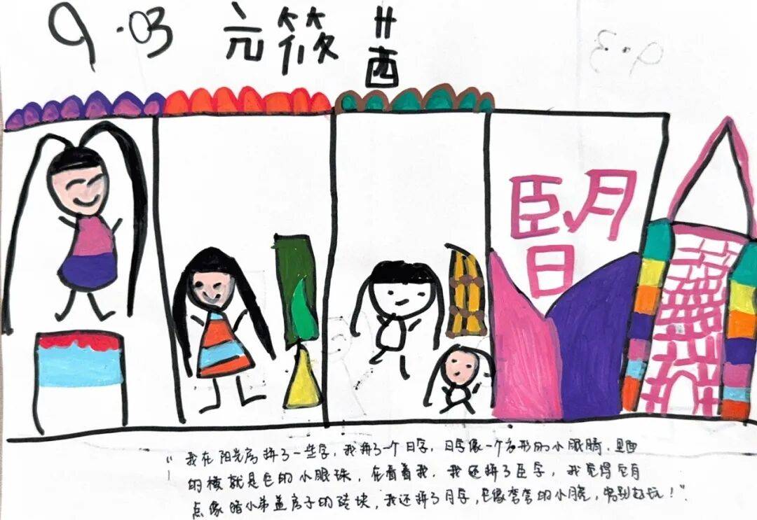 我在阳光房拼了一些字,我拼了一个日字,日字像一个方形的小眼睛,里面的横就是它的小眼珠,在看着我。我还拼了臣字,我觉得它有点像猪小弟盖房子的砖块,我还拼了月字,它像弯弯的小月亮!特别好玩!
