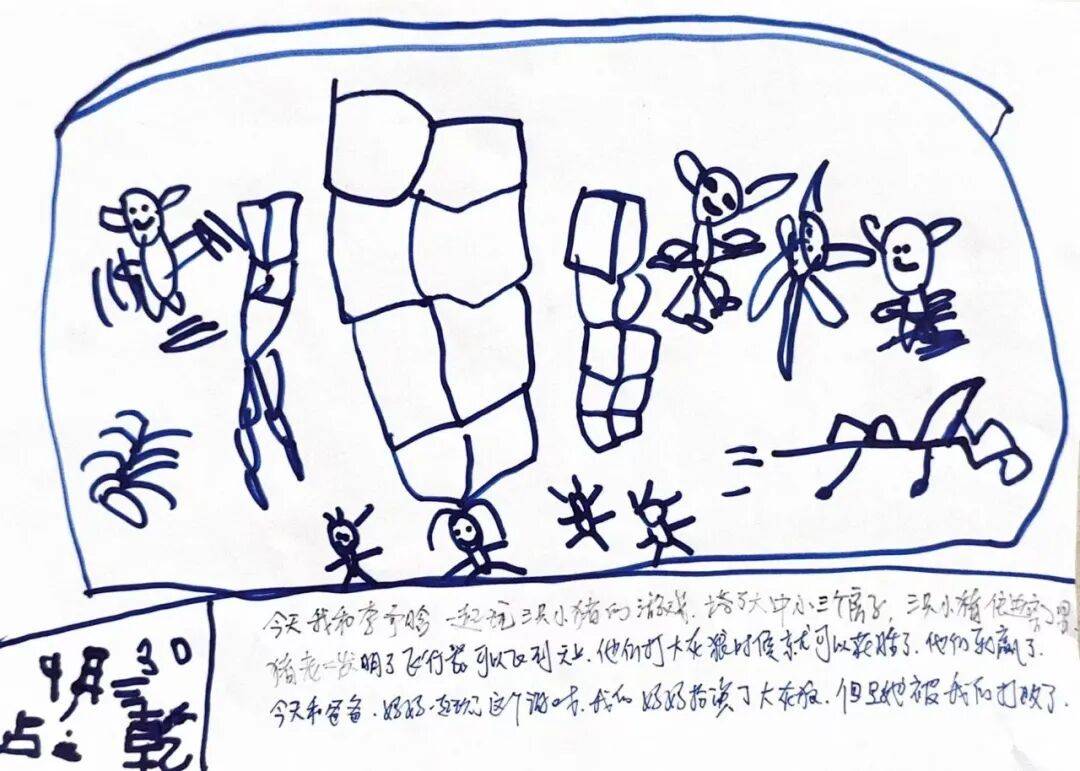 今天我和李予晗一起玩三只小猪的游戏,搭了大中小三个房子,三只小猪住进房子里,猪老二发明了飞行器可以飞到天上,他们打大灰狼的时候就可以获胜了,他们就赢了,今天和爸爸妈妈一起玩了这个游戏,我的妈妈扮演了大灰狼,但是他被我们打败了。