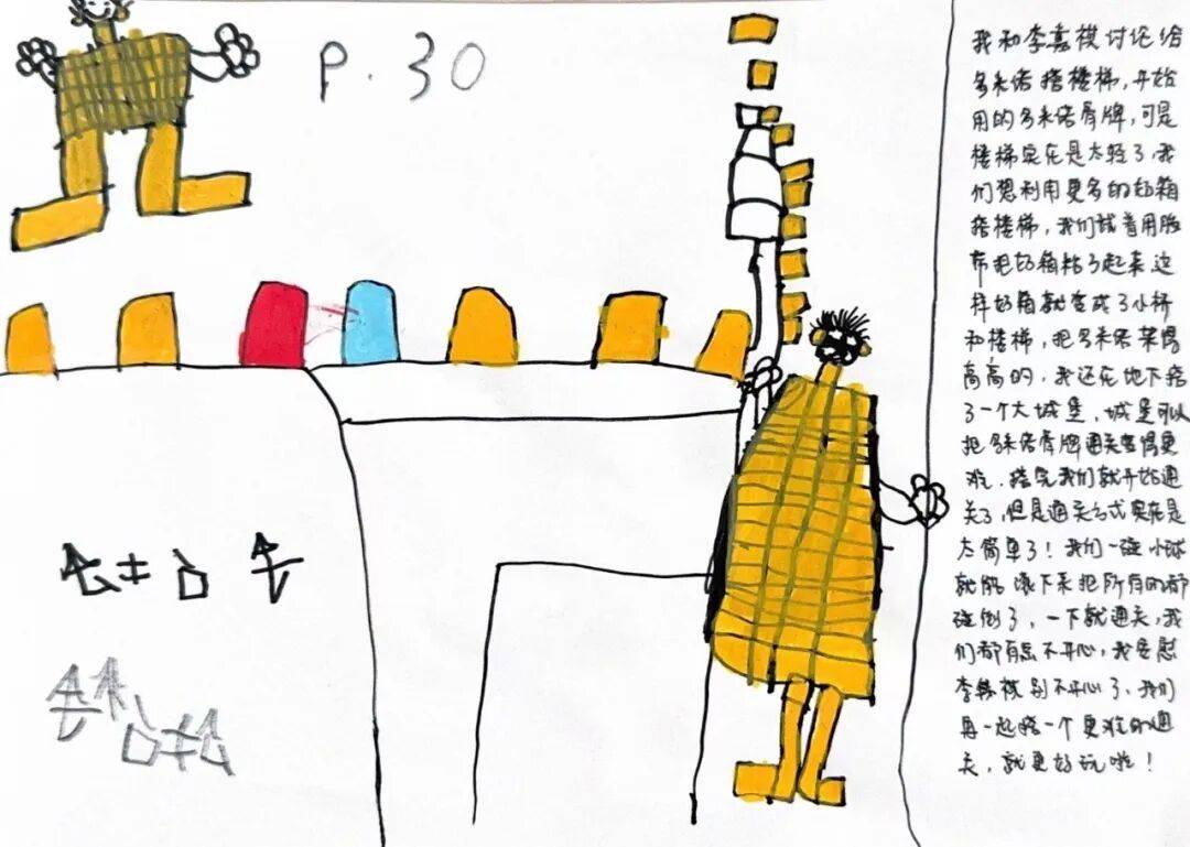 我和李嘉祺讨论给多米诺搭楼梯,开始用的多米诺骨牌,可是楼梯实在是太轻了,我们想利用更多的奶箱搭楼梯,我们试着用胶带把奶箱粘了起来,这样奶箱就变成了小桥和楼梯,把多米诺架的高高的,我还在地下搭了个大城堡,城堡可以把多米诺骨牌通关变得更难。搭完我们就开始通关了,但是通关方式实在是太简单了!我们一碰,小球就能滚下来把所有的都碰倒了,一下就通关,我们都有点不开心,我安慰李嘉祺别不开心了,我们再一起搭个更难的通关,就更好玩啦!