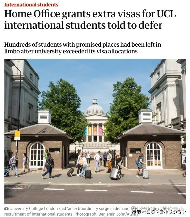 近日,伦敦大学学院(University College London,简称UCL)国际学生签证问题迎来突破。此前,由于学校超出了签证配额,数百名已经获得录取承诺的学生一度面临“入学悬而未决”的困境。