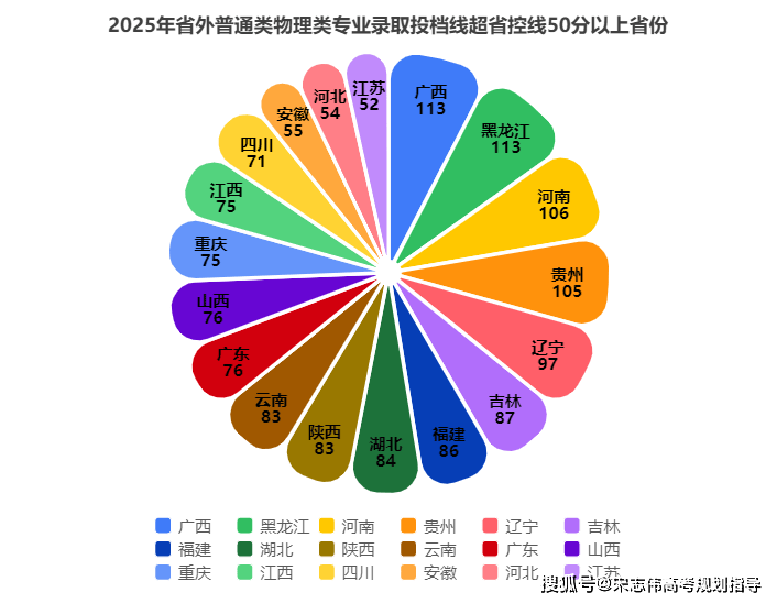 该校在70%以上的外省(市、自治区)投档分高出所在批次省控线50分以上,其中吉林、湖北、广西及黑龙江历史类,广西、黑龙江、河南及贵州物理类投档分均超出所在省份投档分100分。外省录取投档分超省控线50分以上的具体情况如上图所示。