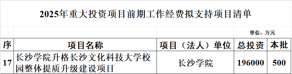 长沙学院升格为长沙文化科技大学,校园整体提质升级建设,总投资19.6亿元。可以说这是一笔十分庞大的投资,说明了省里对该校升格大学的重视程度。