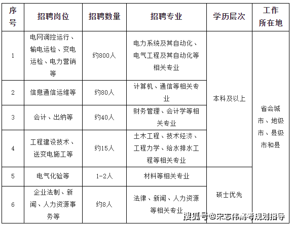 可以看到,电气类专业要的人最多 ,约800人;计算机、通信类专业约80人;财务管理、会计学等相关专业约40人,土木工程、技术经济、工程力学、给水排水工程等相关专业约15人,这四类岗位是本科以上。材料、法律、新闻、人力资源等相关专业招的人就比较少,并且岗位的学历要求是硕士优先。前4类岗位虽然没有写硕士优先,其实硕士更有优势。