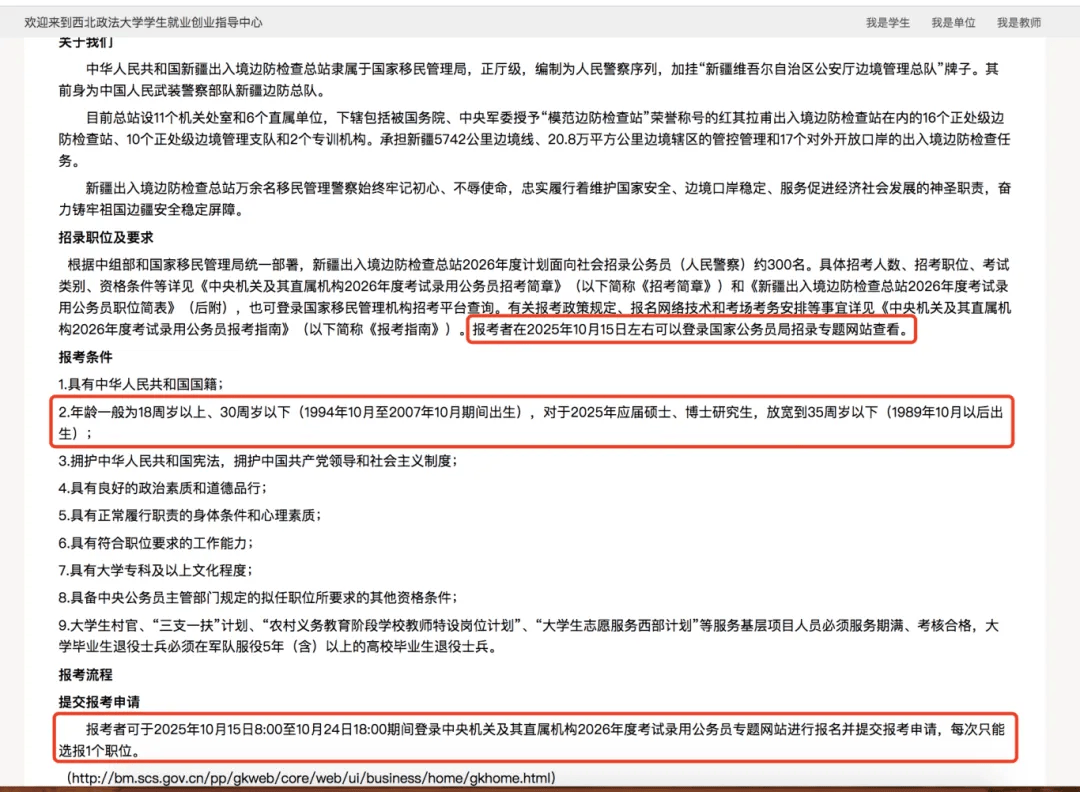 根据中组部和国家移民管理局统一部署,新疆出入境边防检查总站2026年度计划面向社会招录公务员(人民警察)约300名。具体招考人数、招考职位、考试类别、资格条件等详见《中央机关及其直属机构2026年度考试录用公务员招考简章》(以下简称《招考简章》)和《新疆出入境边防检查总站2026年度考试录用公务员职位简表》(后附),也可登录国家移民管理机构招考平台查询。有关报考政策规定、报名网络技术和考场考务安排等事宜详见《中央机关及其直属机构2026年度考试录用公务员报考指南》(以下简称《报考指南》)。报考者在2025年10月15日左右可以登录国家公务员局招录专题网站查看。