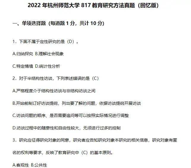 2022年杭州师范大学817教育研究方法考研真题与参考答案(回忆版)