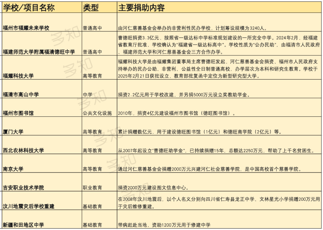 (曹德旺在教育领域的投入和捐助,多知不完全统计)