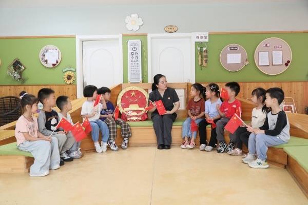活动最后,唐菁法官助理为小朋友们带来了宪法启蒙课,将宪法知识融入亲切的对话中,指着胸前的法徽告诉小朋友们:“大家手里的小国旗代表着我们的国家,而宪法就像国家送给大家的‘超级守护者’,会保护小朋友上学、游戏、被照顾的权利。”