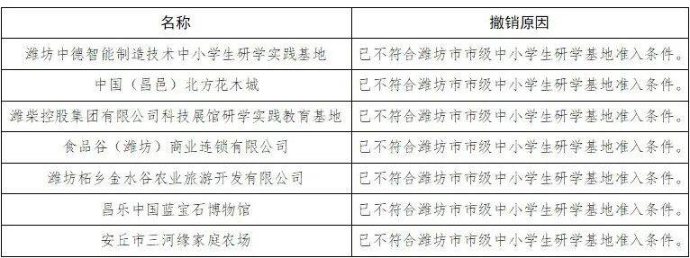 撤销和变更的潍坊市市级中小学生研学基地(营地)名单
