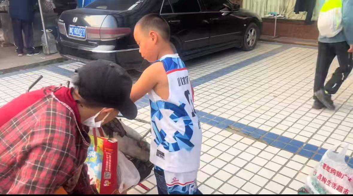 有一次我们在收拾行李的时候,遇到一个拾荒老人推着一个破旧的婴儿车从我们面前路过,我们会引导孩子拿着喝完的矿泉水瓶子递给老人,还分给这个老人牛奶面包,对方也很感谢孩子们,小景送完之后脸上露出憨憨的笑容,我觉得这也是一种很好的教育。