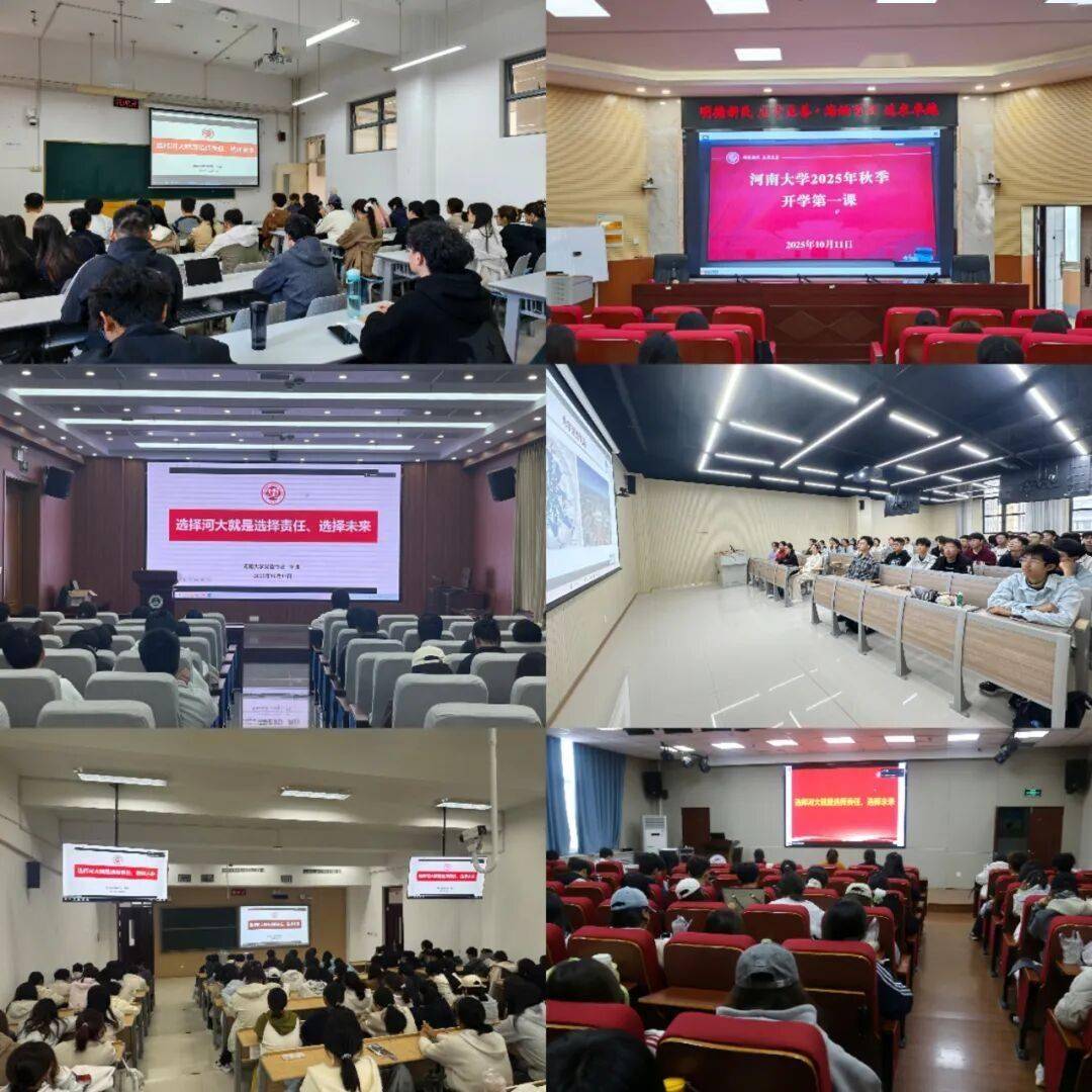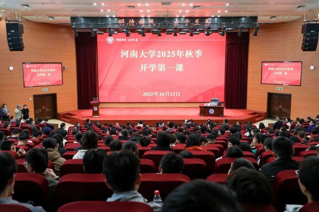 10月11日上午,河南大学党委书记季波在金明校区为学生们讲授开学第一课。校党委副书记李平、杨萌芽,副校长白莹,2025级学生代表、各学院党委书记、教学副院长、团委书记、辅导员代表等近500人现场聆听。各教学培养单位党委副书记、新生在各分会场通过腾讯会议线上参会。