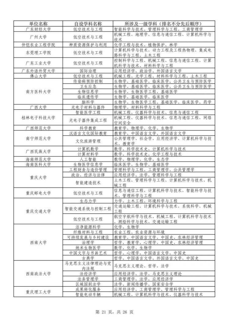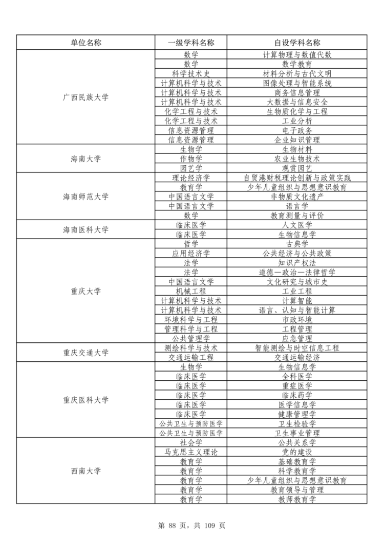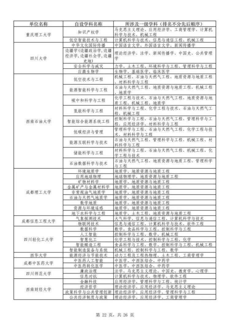 根据公布的名单,重庆大学、西南大学、重庆交通大学、重庆医科大学等高校自设二级学科101个,包括古典学、公共经济与公共政策、文化研究与城市史、计算智能、生物信息学、健康管理学等。