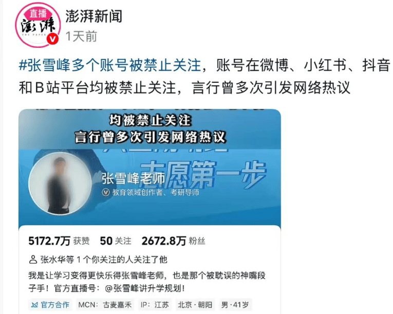 国庆前教育圈最大的瓜就是张雪峰的全网大号被禁止关注。这个我想大家应该刷到过了吧,工作室到现在对外只回应了四个字,“正在反省”。