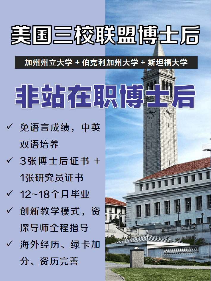 美国三校博士后研究班项目由美国加州州立大学、斯坦福大学、伯克利加州大学三大名校合办。