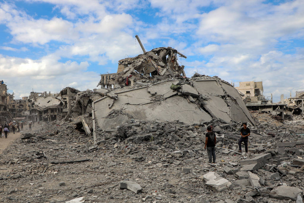 10月12日,在加沙地带南部汗尤尼斯,重返家园的巴勒斯坦人站在废墟中。 以色列与哈马斯在加沙地带的停火12日进入第三天。 新华社 发(里泽克·阿卜杜勒贾瓦德 摄)