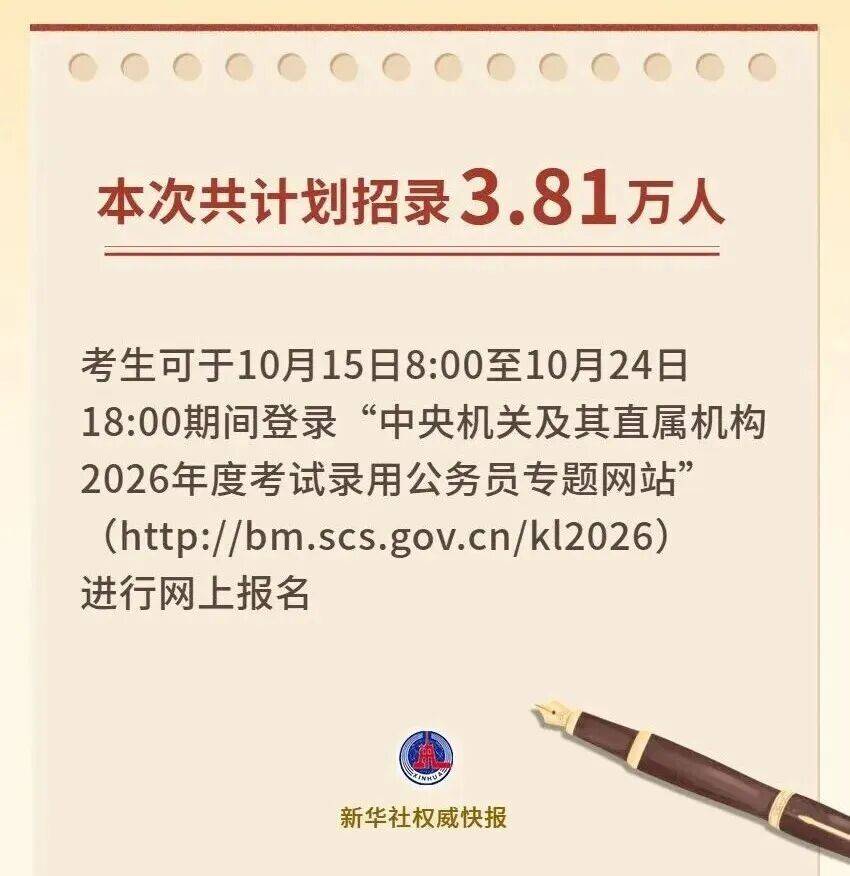 据新华社报道,记者从国家公务员局获悉,中央机关及其直属机构2026年度考试录用公务员共计划招录3.81万人。考生可于10月15日8:00至10月24日18:00期间登录“中央机关及其直属机构2026年度考试录用公务员专题网站” 进行网上报名,公共科目笔试将于11月30日在全国各直辖市、省会城市、自治区首府和部分城市同时举行。