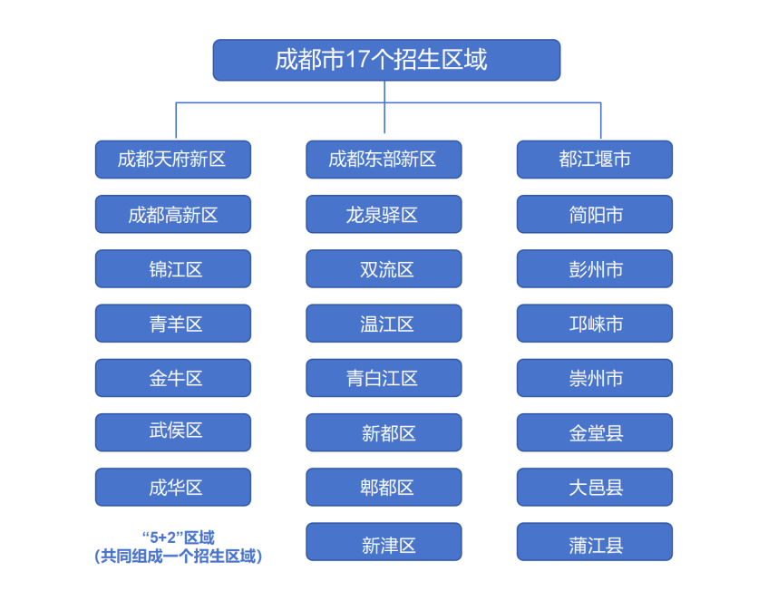 成都分为17个考区,“5+2”(四川天府新区、成都高新区、锦江区、青羊区、金牛区、武侯区、成华区)为一个区域,其余16个区(市)县各作为1个招生区域。