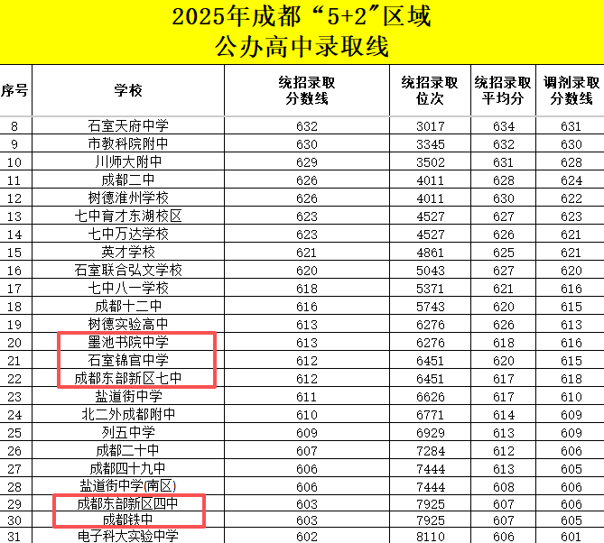 录取线600分以上的学校里,只有墨池书院中学、石室锦官学中学、七中东部、石室东部和成都铁中,这5所学校的调剂线高于统招线。其他学校的调剂线都是略低于或者等于统招线。