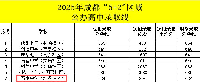 可以看到,石室北湖的调剂线比统招线高2分。除此以外,其他学校(校区)的调剂线都是低于或者等于统招线。七中林荫和树德宁夏的调剂线都比统招线低1分,而七中高新、石室文庙、树德光华和树德外国语的调剂生均与统招线持平。