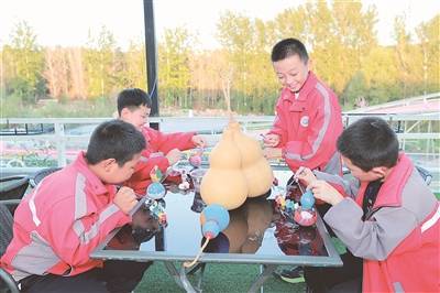 上图:学生们正将喜欢的颜色均匀地涂抹在葫芦上。