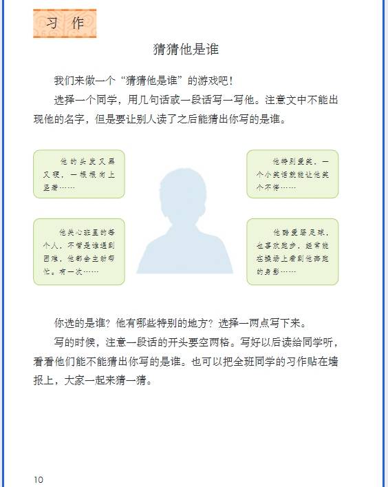 • 写作基础:乐于书面表达,能把自己看到的、听到的、想到的、做过的写清楚、写明白。学习写看图作文、观察日记、简单的记叙文等。