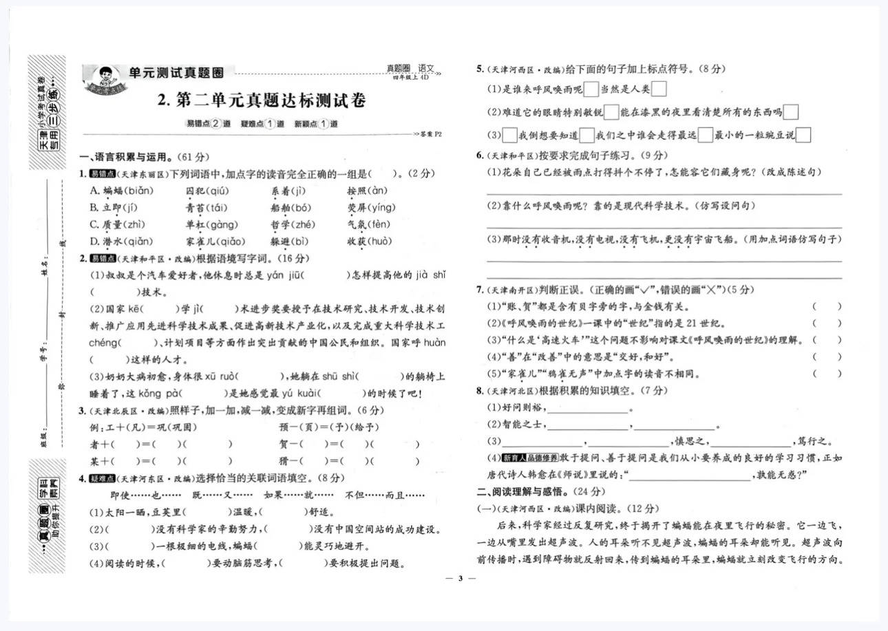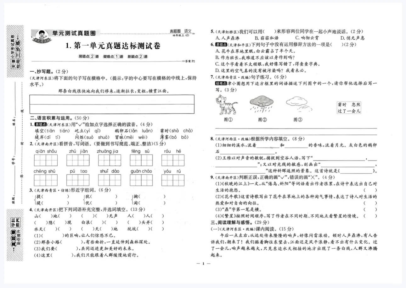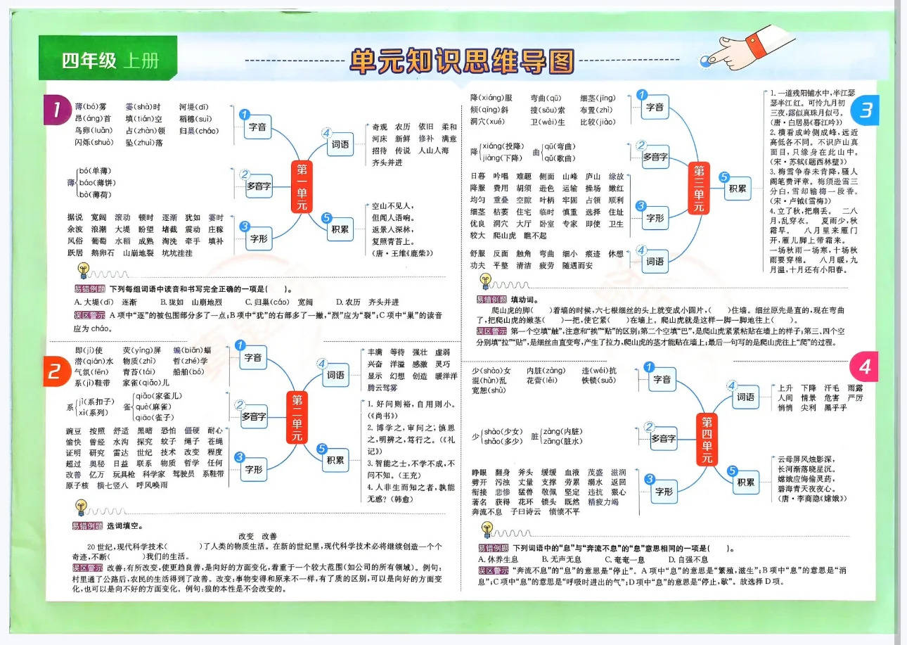 四年级是语文知识整合与能力提升的关键阶段,单元真题达标测试卷能让学生熟悉考试题型,检测对每个单元知识的掌握情况,及时查漏补缺。单元知识思维导图,将每个单元的字音、字形、词语、积累等知识系统梳理,像一张知识网,帮助学生构建清晰的知识体系,加深对知识的记忆与理解。而且资料是天津专用,贴合本地考情,真题练习能让学生提前适应天津小学考试的出题风格与难度,提升应试能力。无论是日常学习中的知识巩固,还是期末复习冲刺,这份资料都能全方位助力四年级学生梳理知识,强化语文技能,提升语文成绩与素养,是四年级上册语文学习,尤其是复习阶段的绝佳好帮手~
