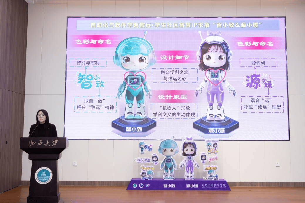 本次发布的“智小致”与“源小媛”IP形象,深度融合自动化与软件学院的学科特色与“致远”文化品牌内涵,以具有专业辨识度的机器人作为主体造型。“智小致”以“山大蓝”为主色调,体现智能控制与系统优化的学科脉络;“源小媛”主色“丁香紫”,象征源代码与程序创新的学科根基。二者命名皆与“致远”精神相呼应,体现学院引导学生在专业领域中笃行致远、追求卓越的育人理念。