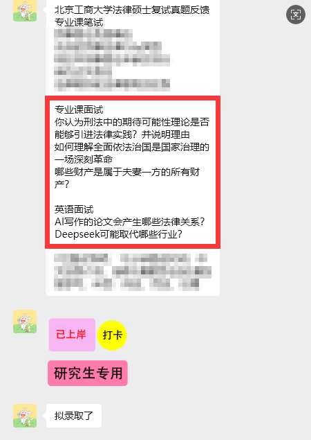 7位面试导师,15分钟面试时间,中文自我介绍,抽取3道题目任选2道回答即可,科目:刑法、民法、法理