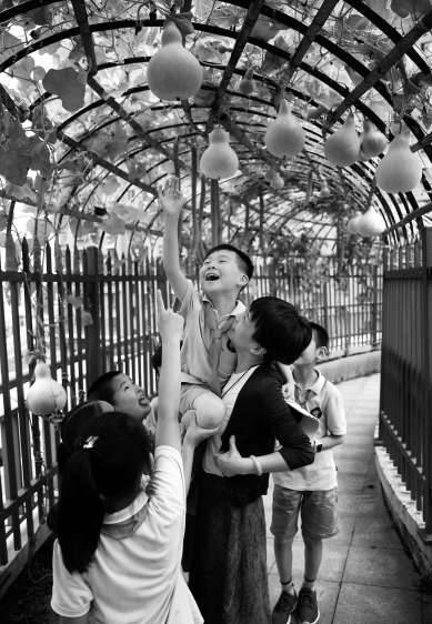 浙江省杭州市濮家小学学生在楼顶农场采摘。 学校供图