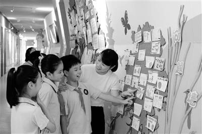 浙江省杭州市濮家小学师生在“问题墙”前交流。
