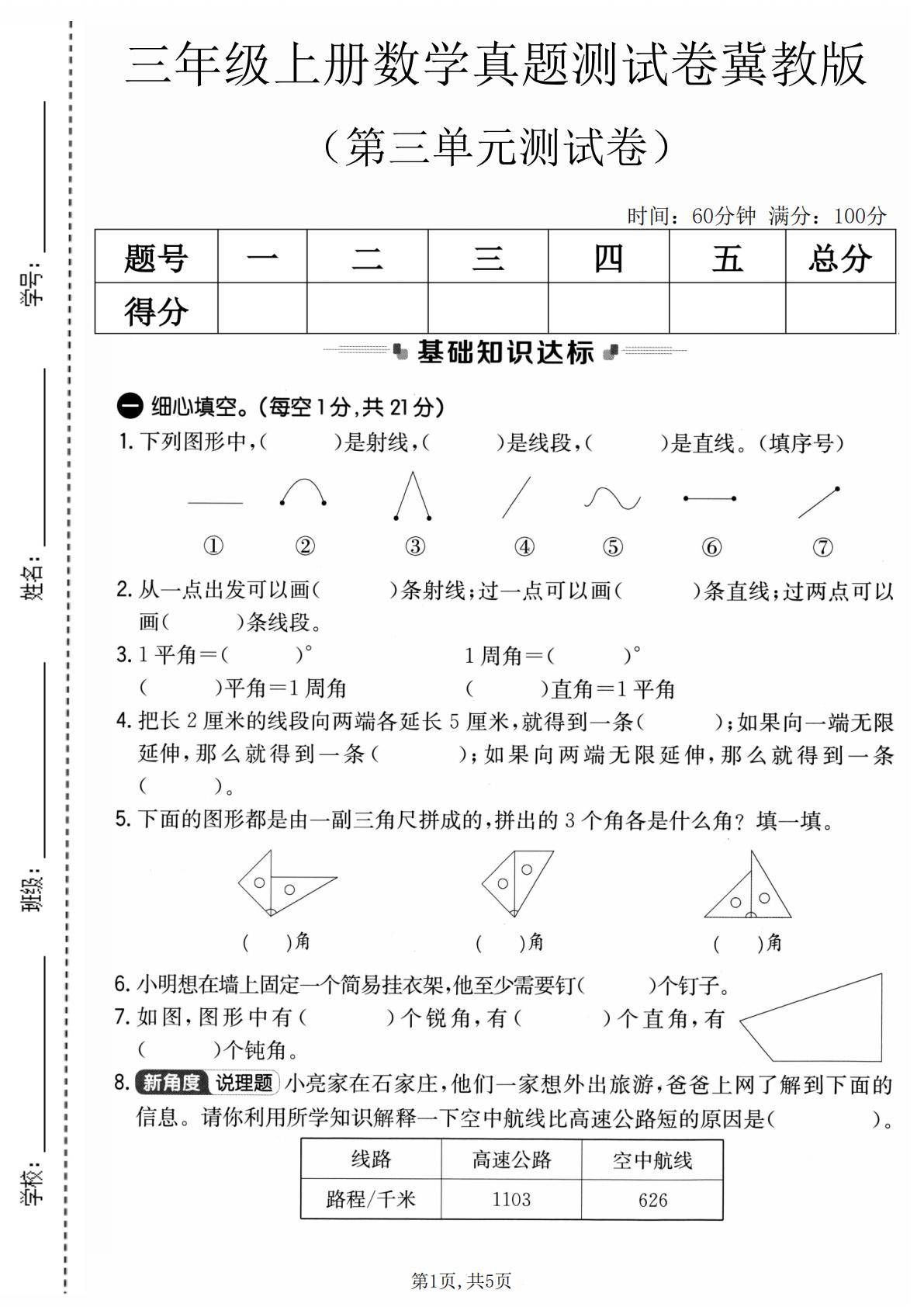 今天为大家分享:三年级(上)冀教版数学第三单元真题测试卷1,围绕线与角的相关知识展开,内容全面且具有较强的系统性与实用性。从涵盖内容来看,包含基础知识达标板块下的细心填空、准确判断、轻松选择以及按要求做题等部分。填空部分涉及射线、线段、直线的辨别,射线、直线、线段的绘制数量,平角、周角、直角的度数关系,线段延长后得到的线的类型,三角尺拼角的类型,固定物体所需钉子数,图形中锐角、直角、钝角的数量,以及利用数学知识解释空中航线比高速公路短的原因等,全面考查学生对线与角基础知识的掌握与应用。