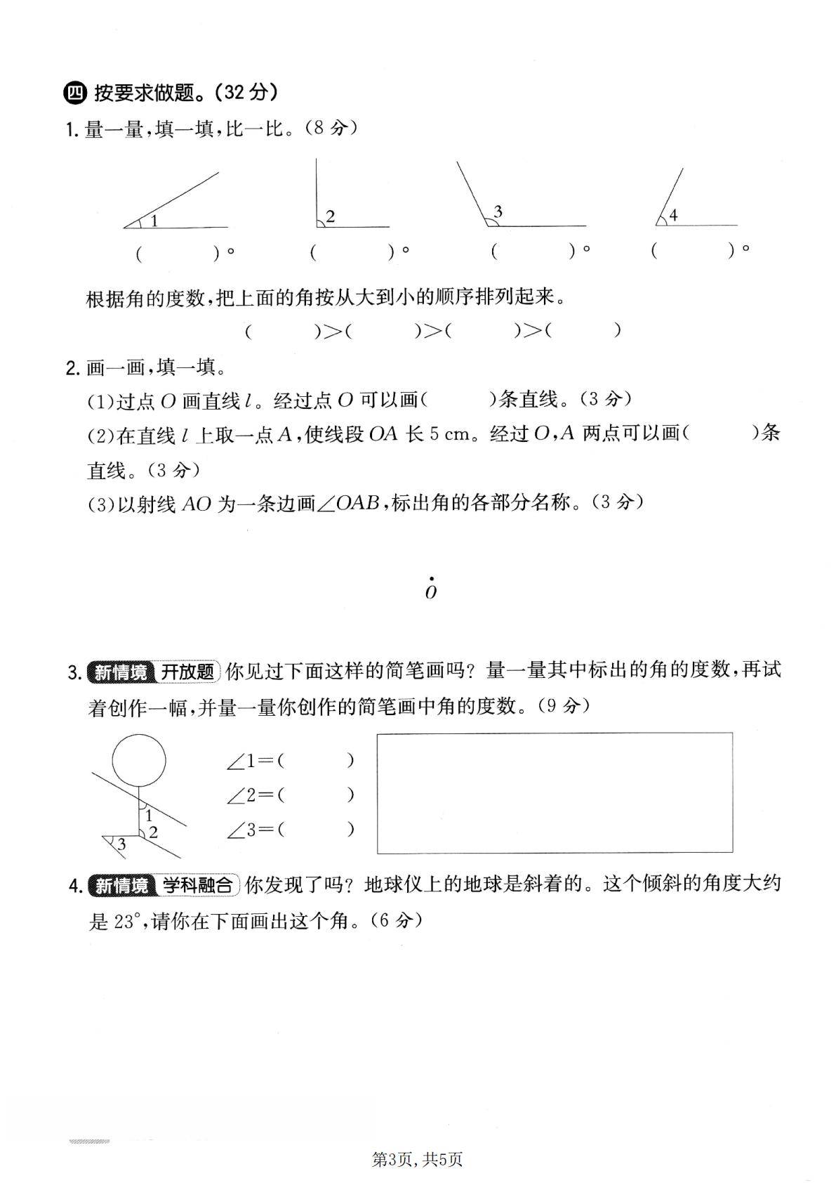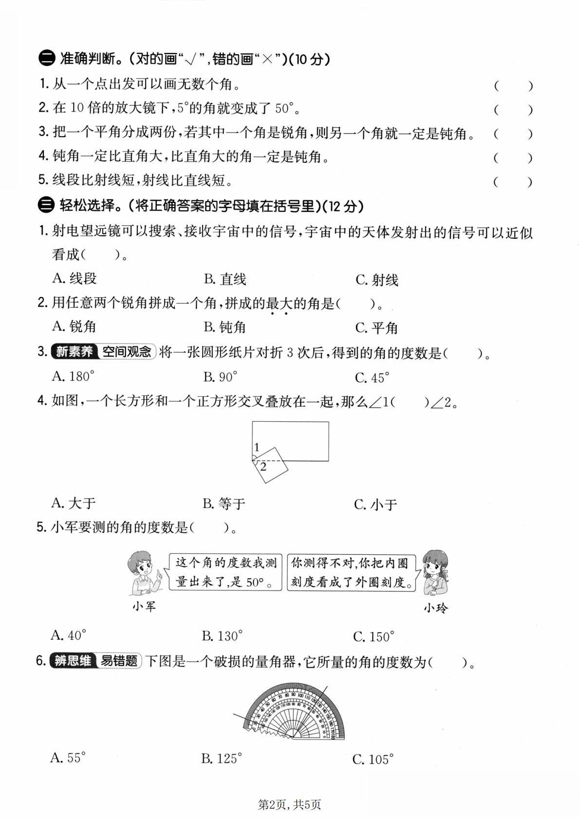 判断部分围绕角的绘制、放大镜下角的度数、平角的拆分、钝角与直角的大小关系、线段射线直线的长度比较等进行,考查学生对线与角概念的理解深度。选择部分则结合射电望远镜信号、锐角拼角、圆形纸片对折、长方形正方形交叉叠放的角、量角器量角等情境,考查学生对线与角知识的综合运用和空间思维能力。按要求做题部分,有量角、画直线、画线段、画角以及结合简笔画、地球仪倾斜角的创作与绘制等,注重学生的动手操作和实践应用能力。