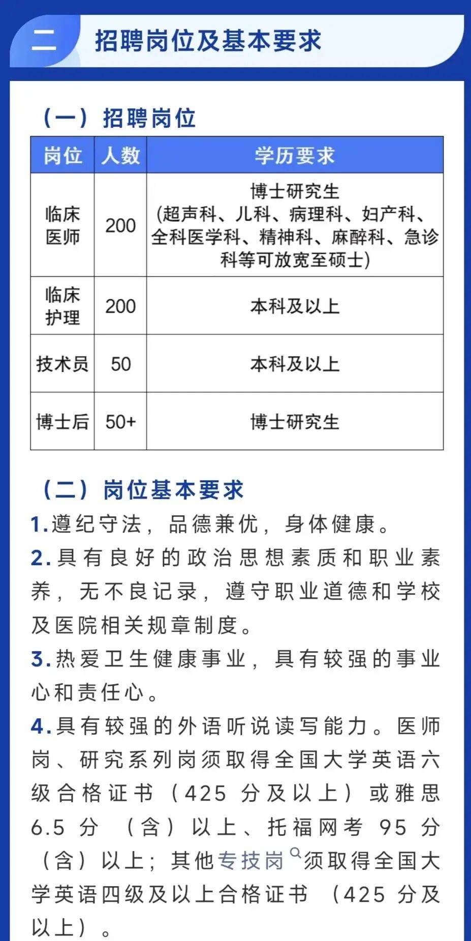这里面明确提到招收临床医生200人,招聘规模非常庞大,但这里面明确提到需要拥有博士研究生学历,只有部分麻醉科、急诊科等特殊科室可放宽至硕士。