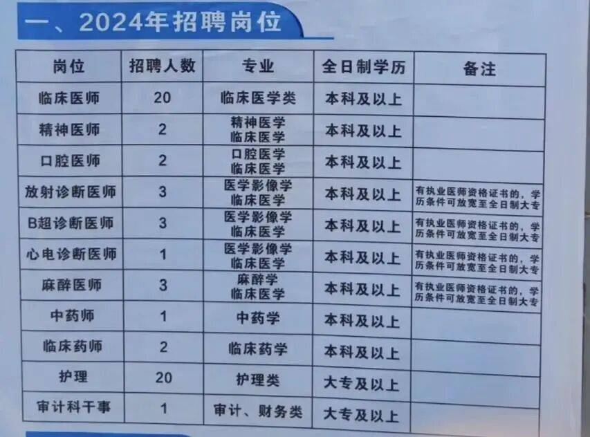 第四家西部普通县级二甲医院。该医院计划招聘58名高校毕业生,临床医师和护理均为20人,还有审计等非医学类的岗位。