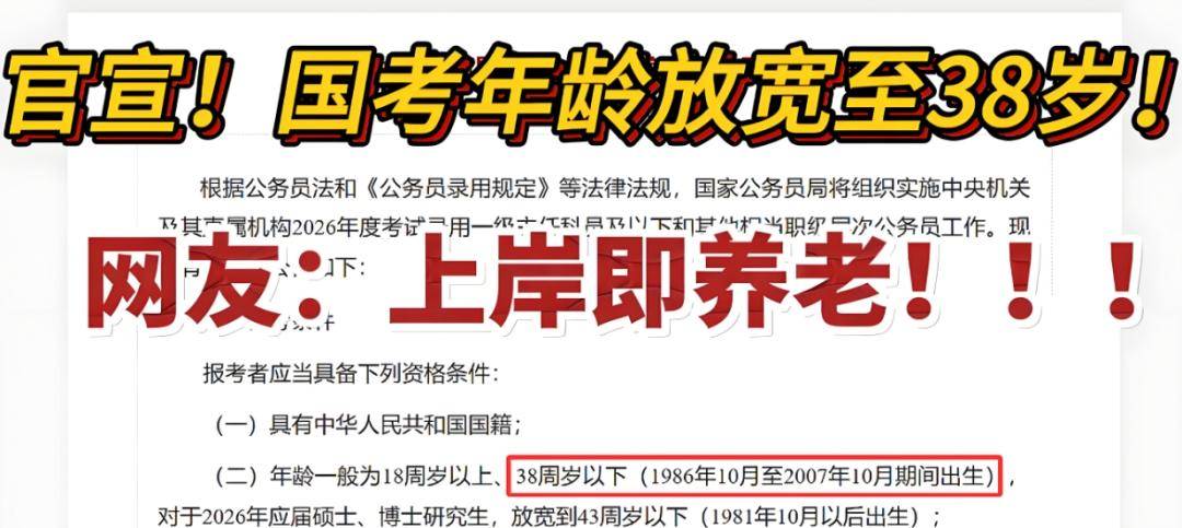 2026 年国考公告一出来,“本科 38 岁可考、应届硕博放宽到 43 岁” 的消息,让不少被 35 岁门槛卡了多年的人瞬间沸腾,甚至已经开始翻出备考资料。但别高兴太早,这次年龄放宽远不是 “多了 3 年考试机会” 这么简单,尤其竞争压力的变化,比 “能考” 这件事更值得关注,想考之前得先把账算明白。