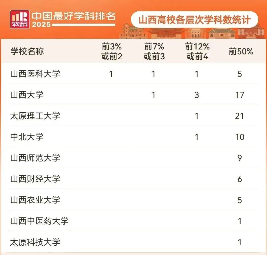2025年10月15日,高等教育评价专业机构软科正式发布“2025软科中国最好学科排名”,这场覆盖全国517所高校、5344个学科点的实力比拼中,山西高等教育交出亮眼答卷:9所高校强势上榜,其中山西医科大学特种医学学科蝉联全国第一,太原理工大学以21个上榜学科领跑省内高校,尽显三晋学科建设的“科技含金量”。