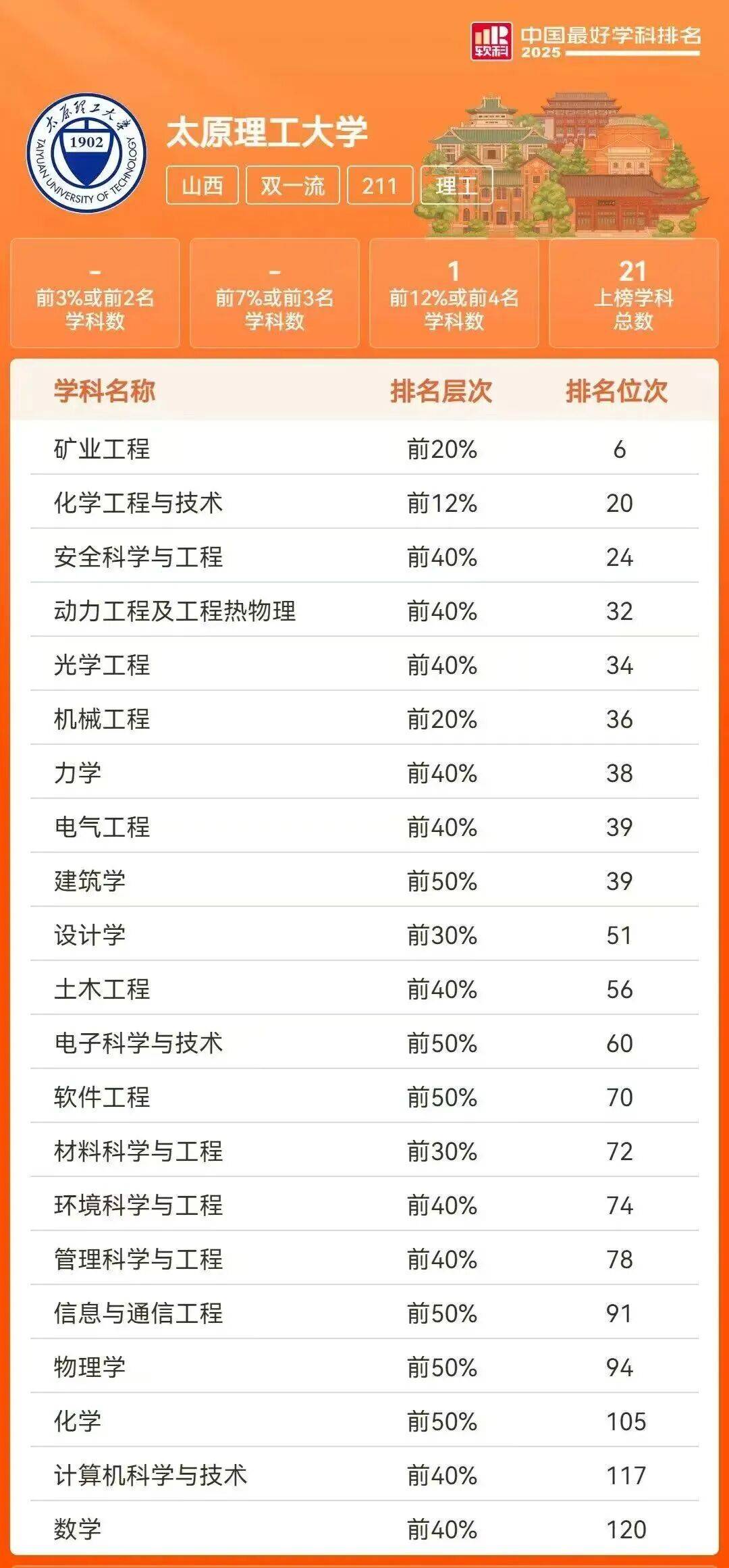 作为省内工科龙头,太原理工大学则展现出“多点开花”的学科布局优势。其21个上榜学科较去年新增2个,在智能科学与技术、材料科学与工程等多个工科领域持续领跑,其中区块链工程专业更是跻身软科A+专业行列,彰显学校在新兴科技领域的布局深度。这种学科扩容并非简单叠加,而是依托学校在能源、材料等传统优势领域的科研积淀,逐步向智能装备、数字技术等新兴方向延伸,形成与山西产业升级需求高度适配的学科体系。