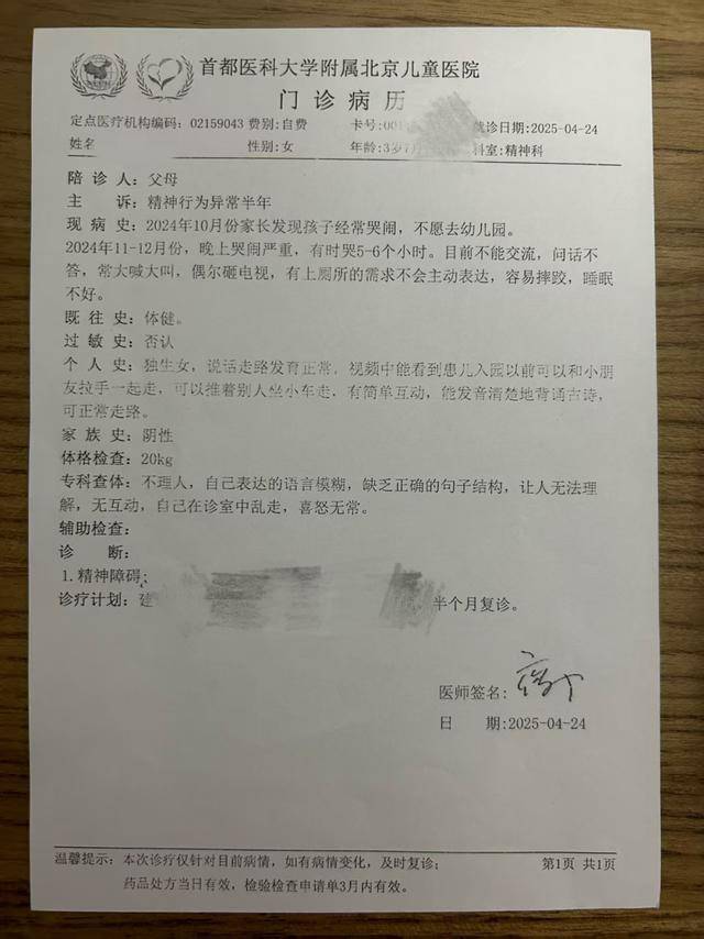 孟先生夫妇并不甘心。称自孩子出事以来,二人带其多次前往医院诊疗,根据他提供的一份首都医科大学附属北京儿童医院的门诊病历,诊断结果显示孩子为精神障碍,“还有医生出具了‘未特定性精神障碍’的诊断。”