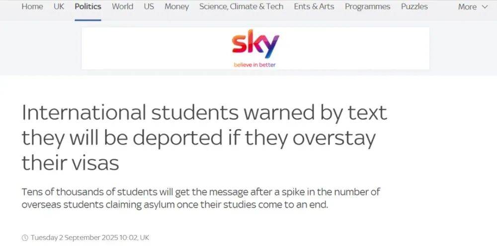 今年9月,英国内政部直接向13万名签证即将到期的国际学生发送短信与邮件,警告逾期滞留或滥用庇护制度者将被驱逐出境。