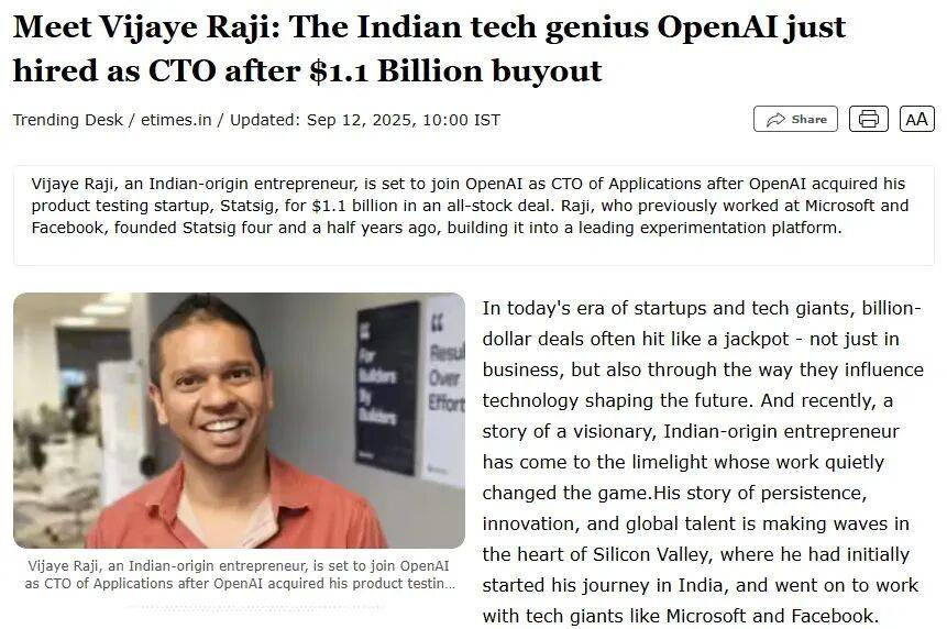 今年9月,OpenAI斥巨资收购实验平台Statsig,还任命印度裔创始人jaye Raji为应用部门新CTO。