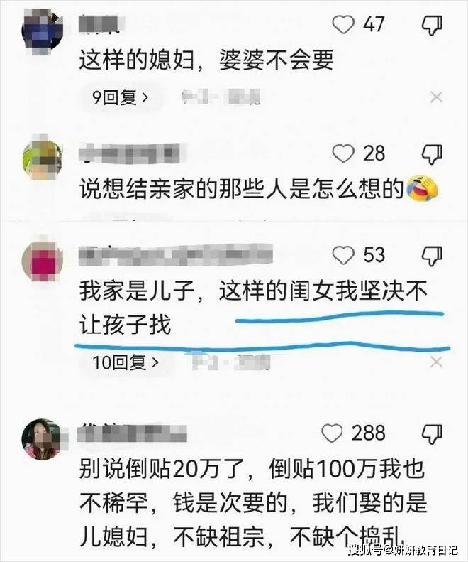 在网上随便一看就发现,那些有可能会变成未来亲家的网友纷纷都在表达同一个观点,那就是“这女儿我们家才不会娶呢,如果我的儿子娶这种女孩子,我会把他们一起赶出家门”。