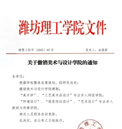 近日,有网友在社交媒体透露,10月的第一天,潍坊理工学院正式宣布撤销美术与设计学院建制,其5个专业分别并入师范学院、新闻与传媒学院,相关人员职务自动免除。