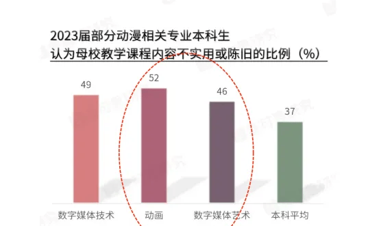 麦可思研究显示,2023届动画、数字媒体艺术专业从事非专业对口工作群体中,因为“达不到专业相关工作的要求”选择与专业无关工作的比例分别为18%、13%,明显高于本科平均水平(10%)。