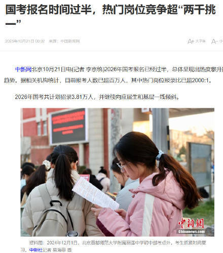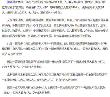 2026年国考报名已经过半,总体呈现出热度攀升的趋势。据相关机构统计,目前报考人数已超百万人,热门岗位竞争超“两千挑一”。截至10月20日晚21时,中国残联教育就业部“教育处一级主任科员及以下”一职审查通过人数为2424人,该职位招考人数为1人,报录比已达2424:1。