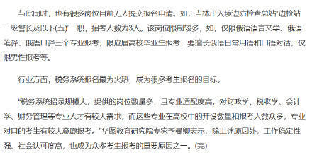 此外,还有330人待审查。与此同时,也有很多岗位目前无人提交报名申请。如,吉林出入境边防检查总站“边检站一级警长及以下(五)”一职,招考人数为3人。该职位限制较多,如,仅限俄语语言文学、俄语笔译、俄语口译三个专业报考,限应届高校毕业生报考,要擅长俄语日常用语和口语对话,仅限男性报考等。