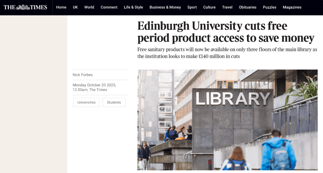 《泰晤士报》日前曝光称,爱丁堡大学因为面临财政困难,试图在未来18个月内削减1.4亿英镑的开支。为此,该校决定减少在校园里提供免费经期产品,只在主图书馆的三层楼里提供。以前,该建筑的八层中至少有六层提供免费经期产品。